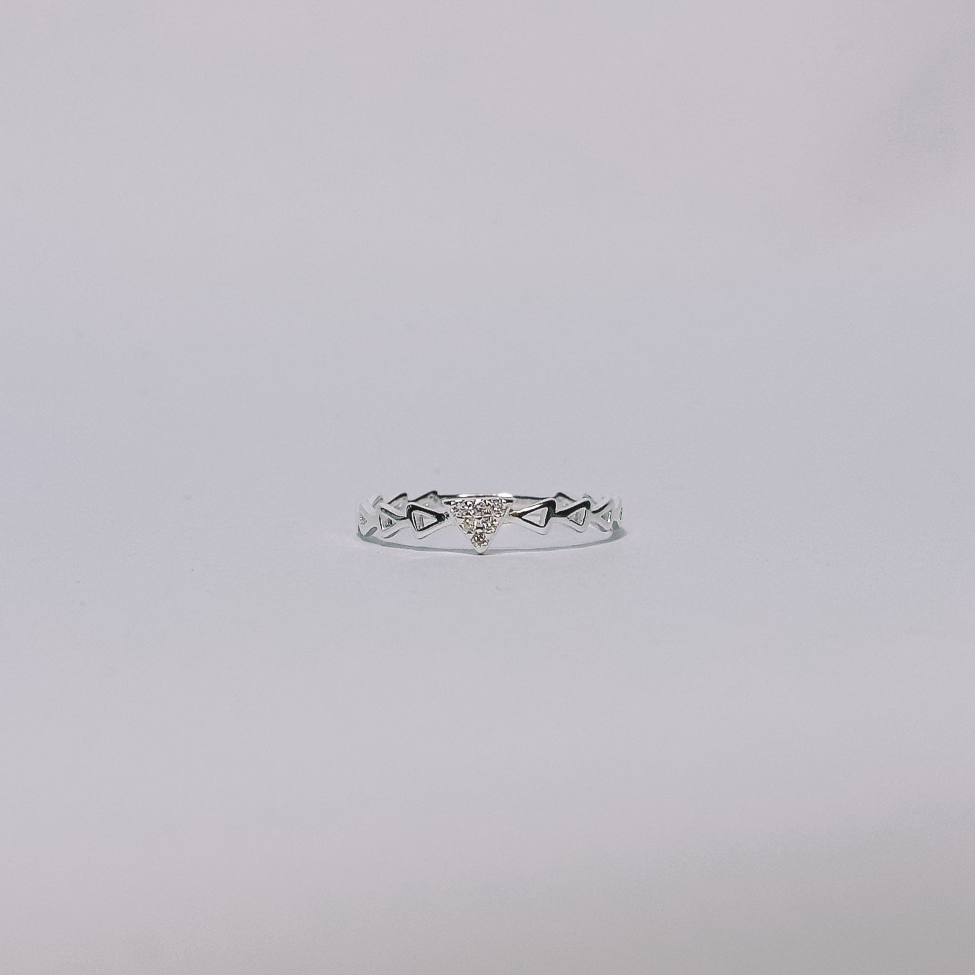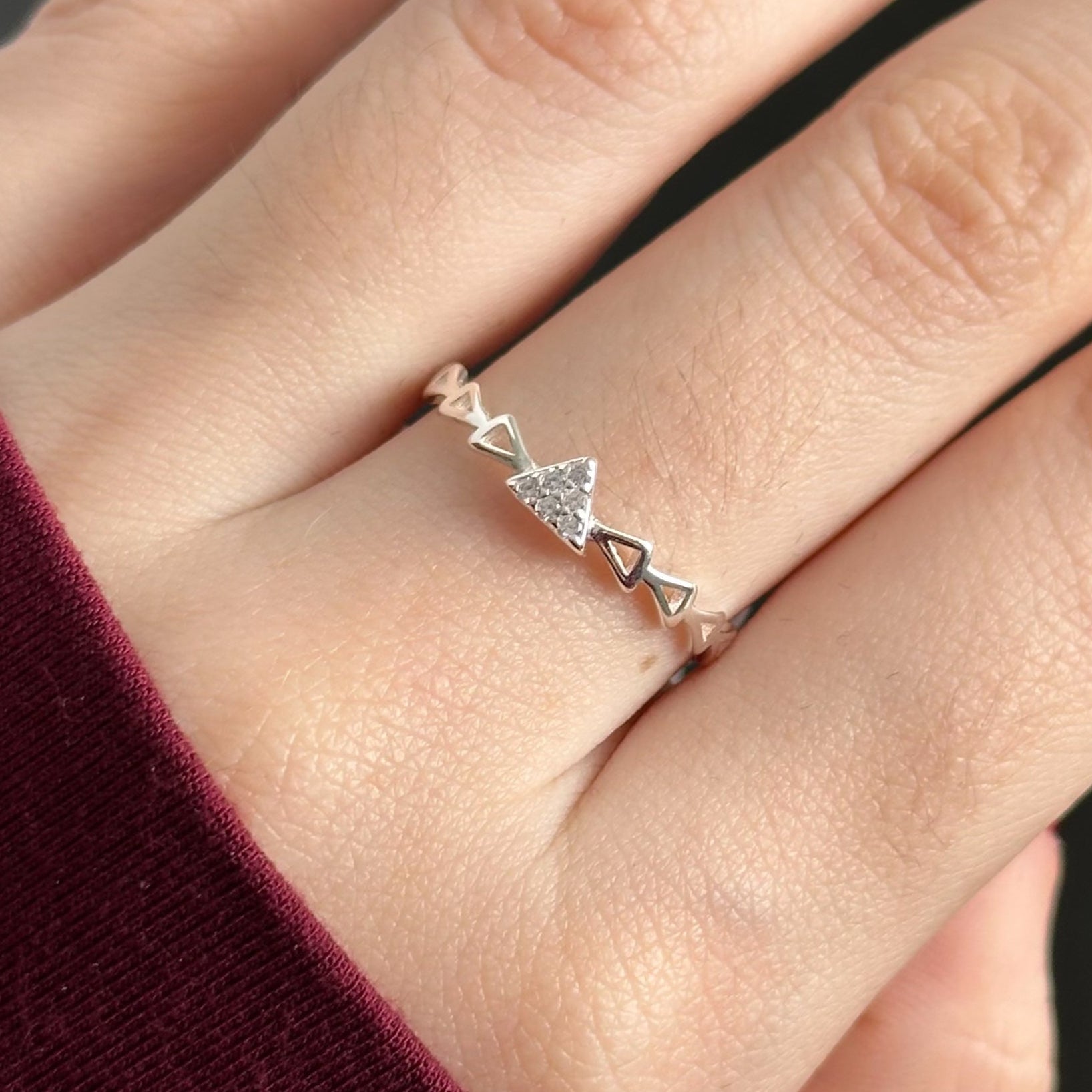 Anel confeccionado em Prata 925 legítima, com detalhes geométricos de triângulos vazados e um triângulo central cravejado de zircônia.