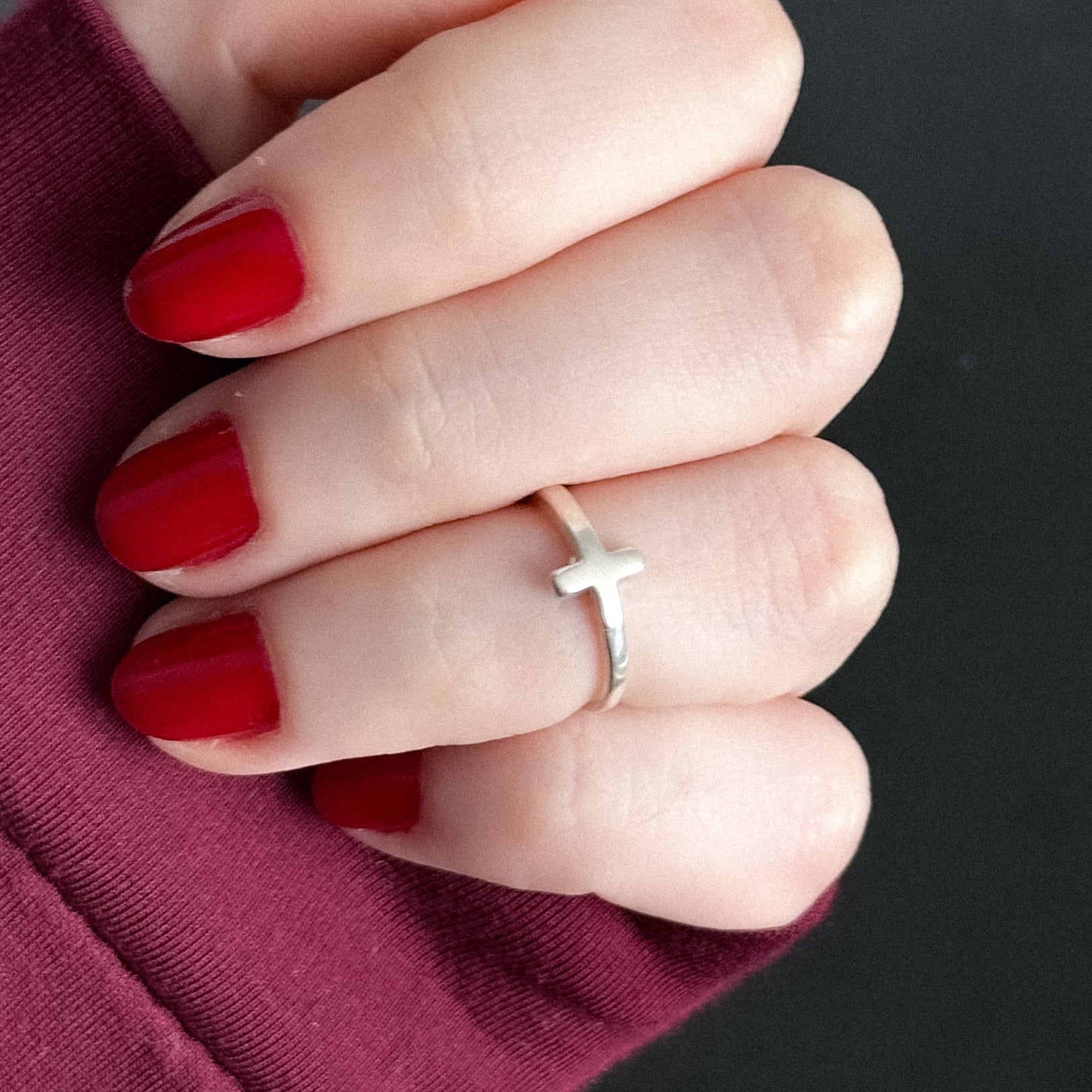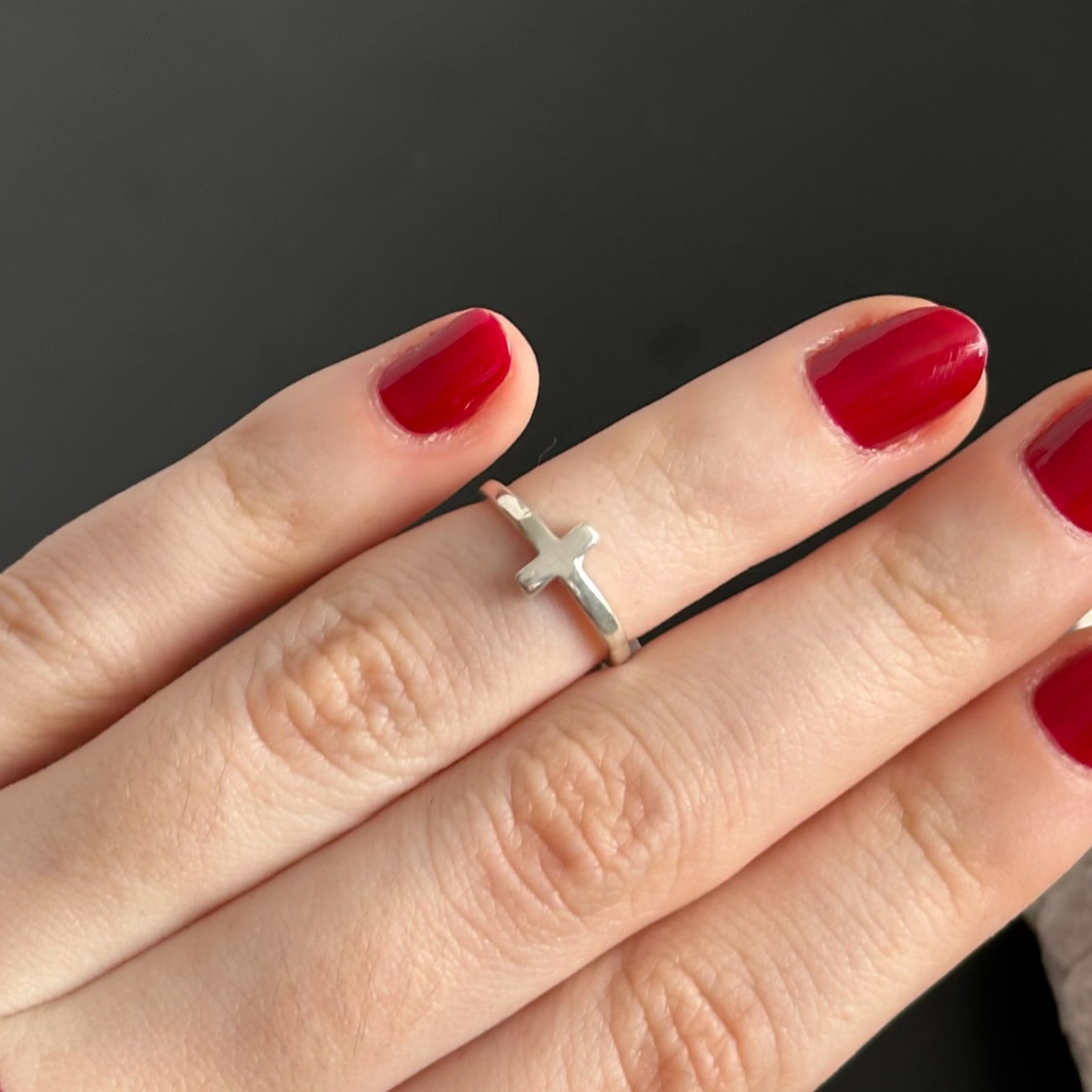 Anel de falange confeccionado em Prata 925 legítima, com design minimalista de aro fino e cruz central lisa.