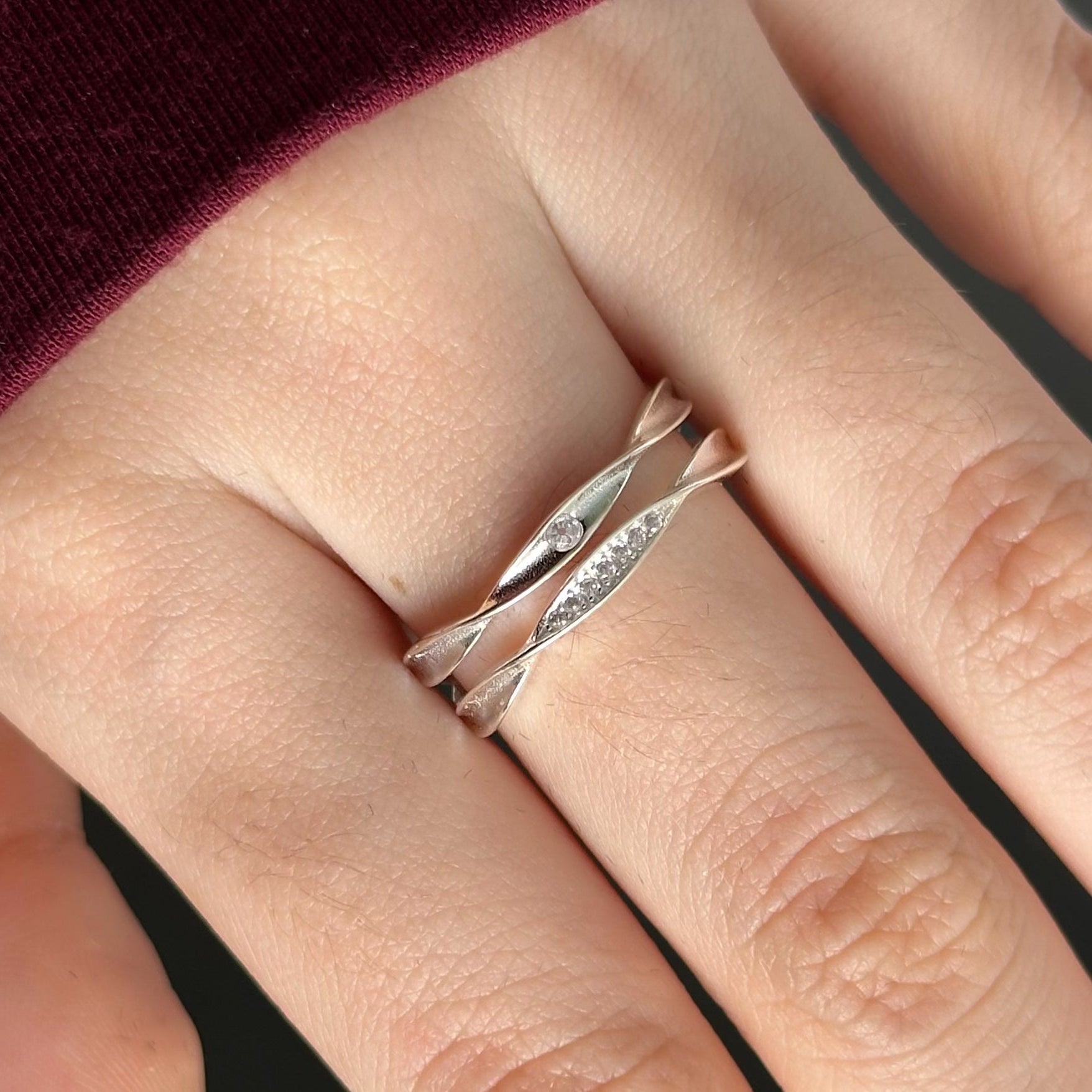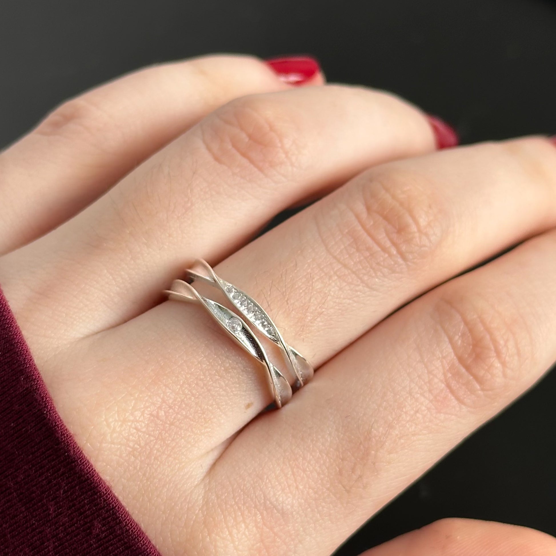 Anel confeccionado em Prata 925 legítima, com design duplo de fios entrelaçados. A peça apresenta um brilho delicado com detalhes cravejados em zircônia, combinando leveza e sofisticação em cada curva.