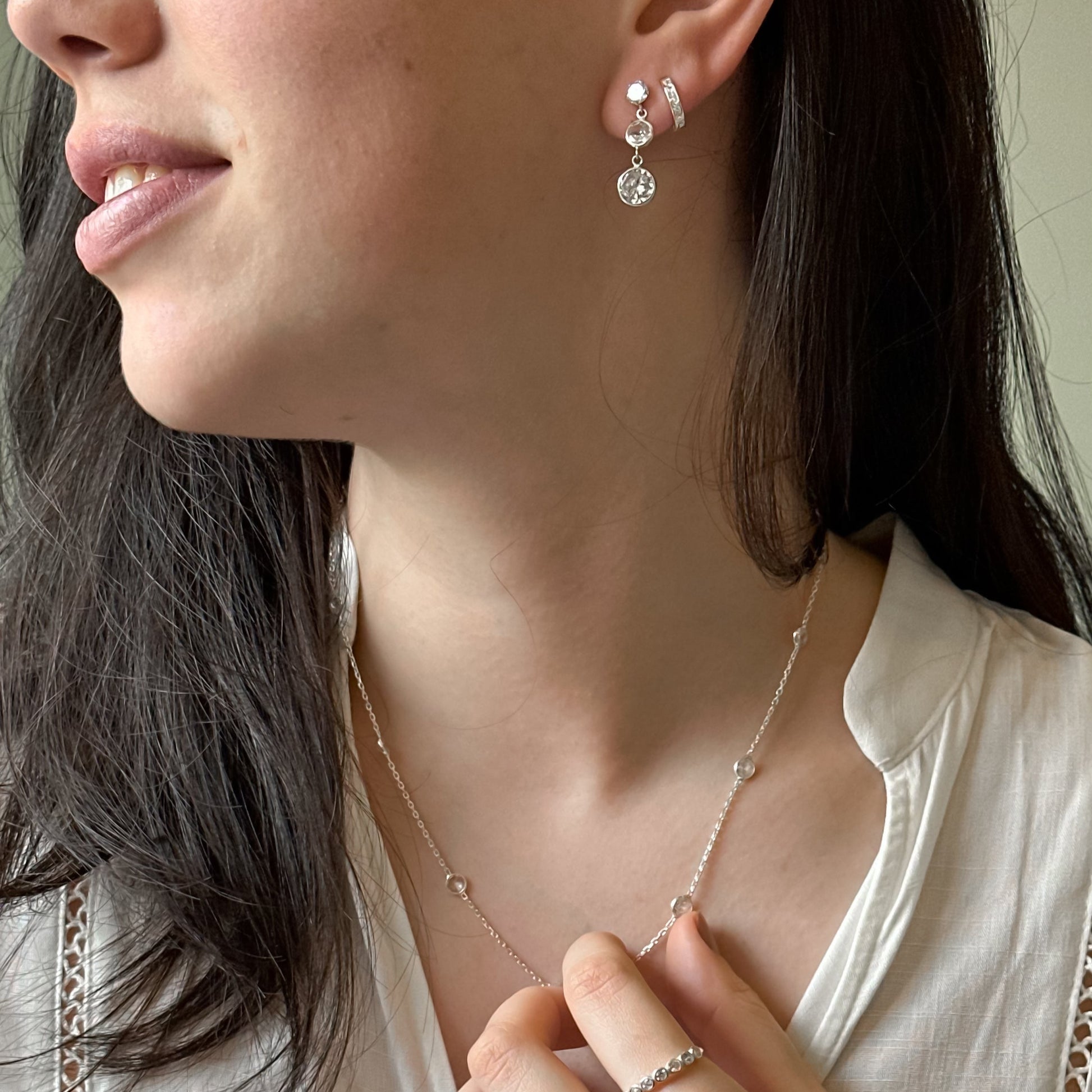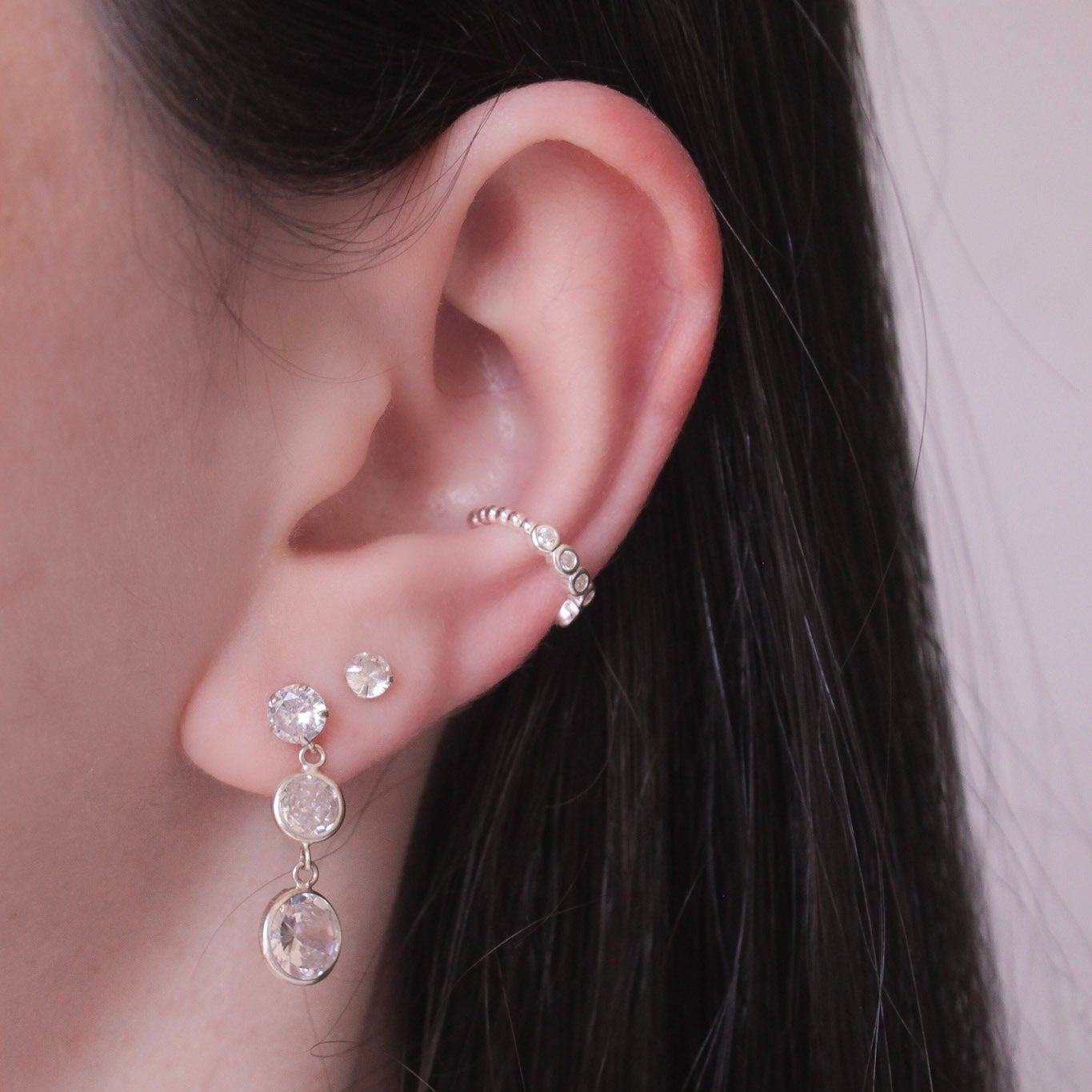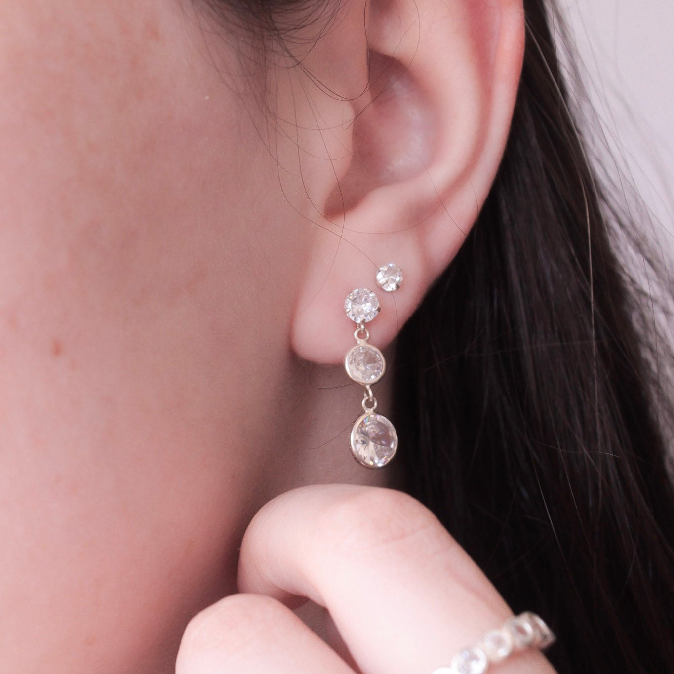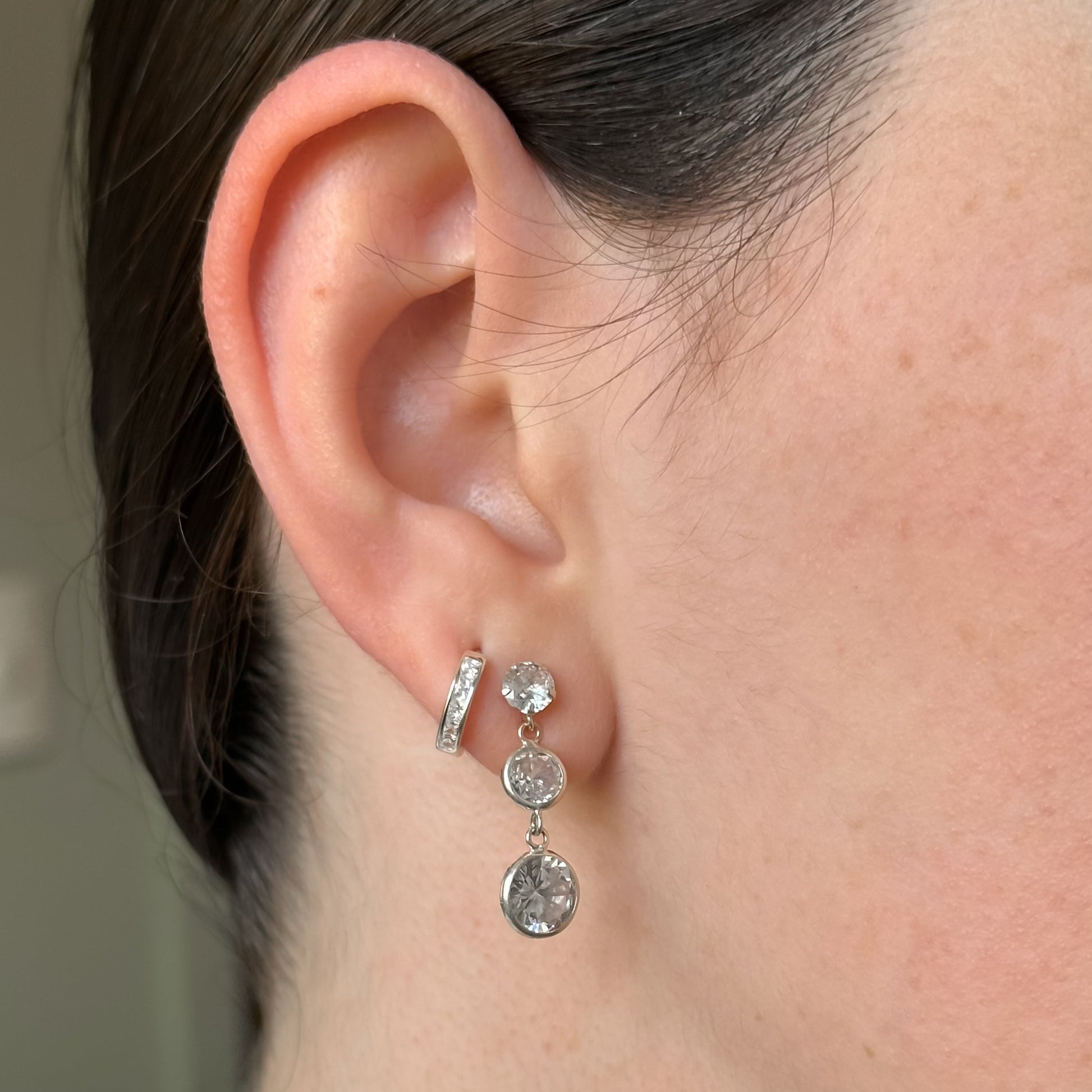 Brinco elegante em Prata 925 legítima com três zircônias em tamanhos graduais, sendo duas delas em cravação inglesa que valorizam o brilho e a transparência das pedras.