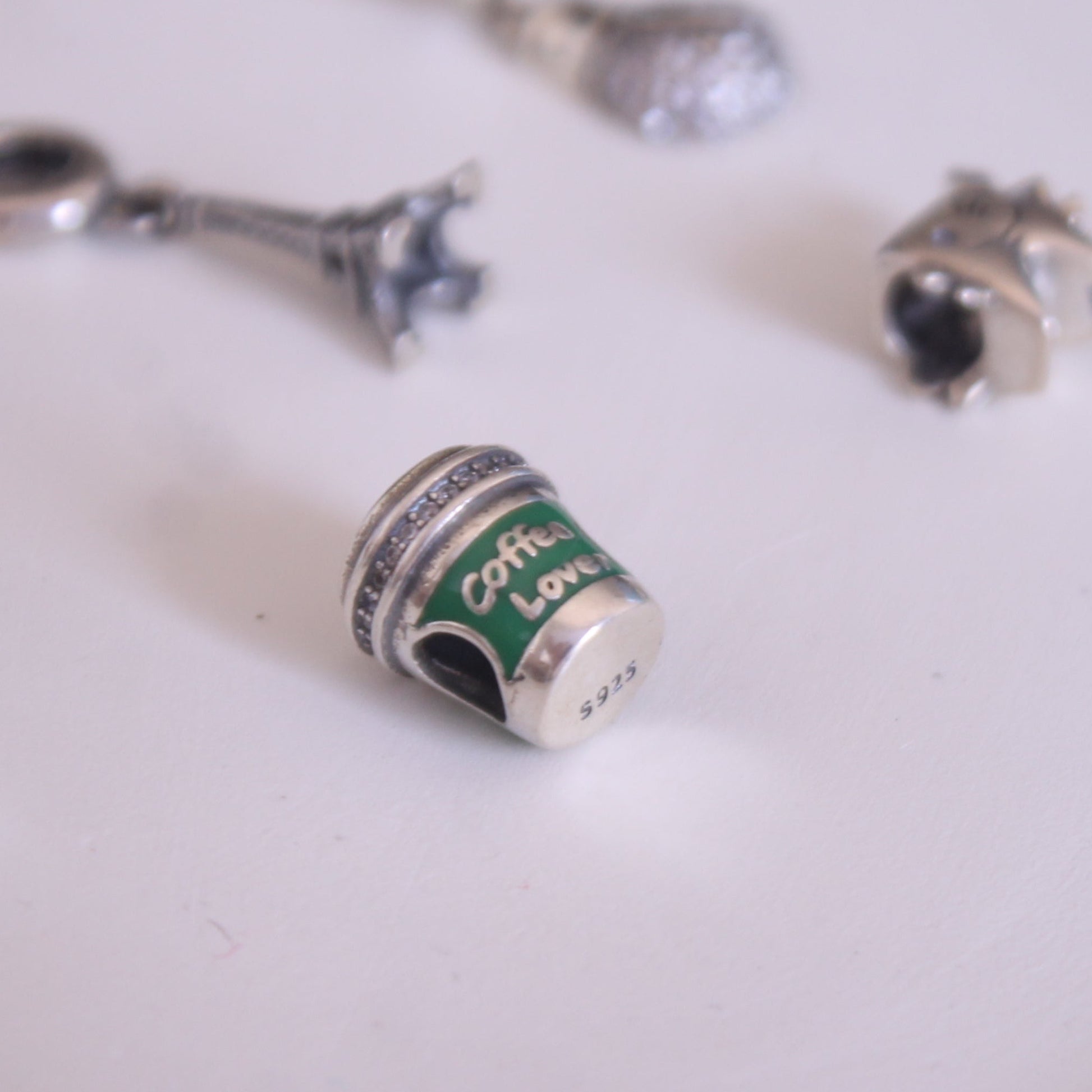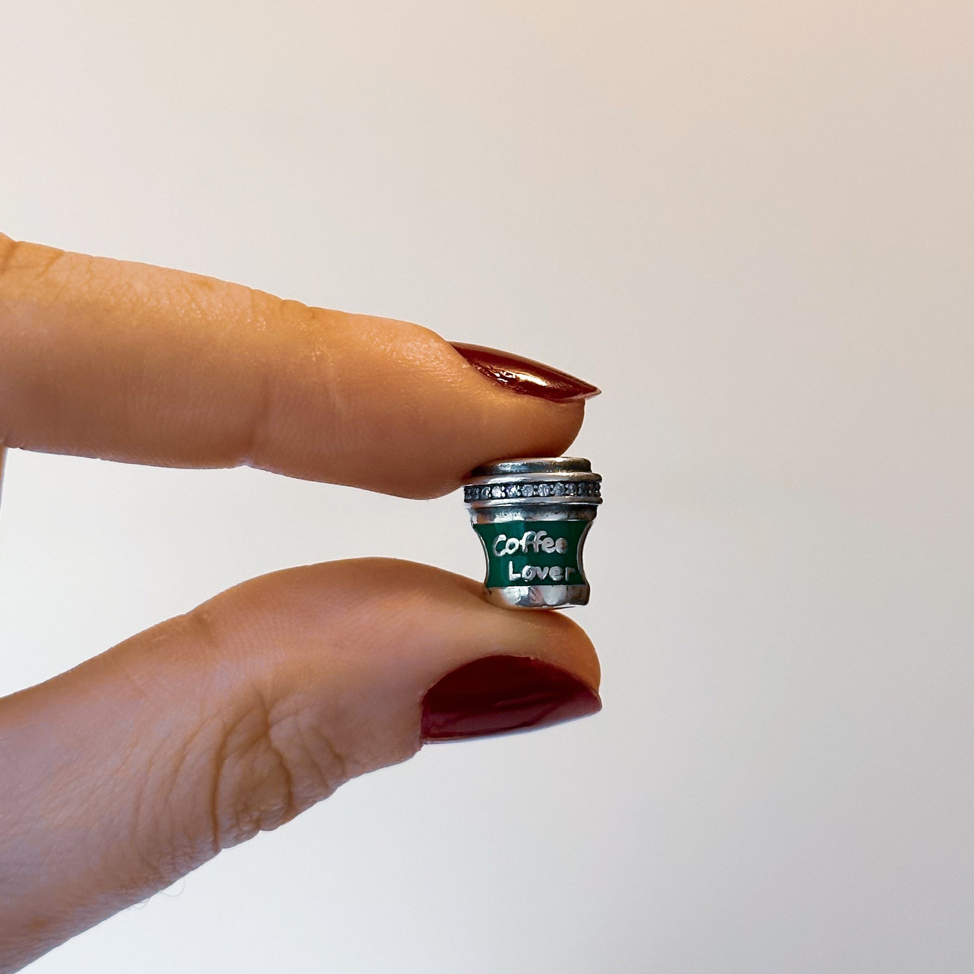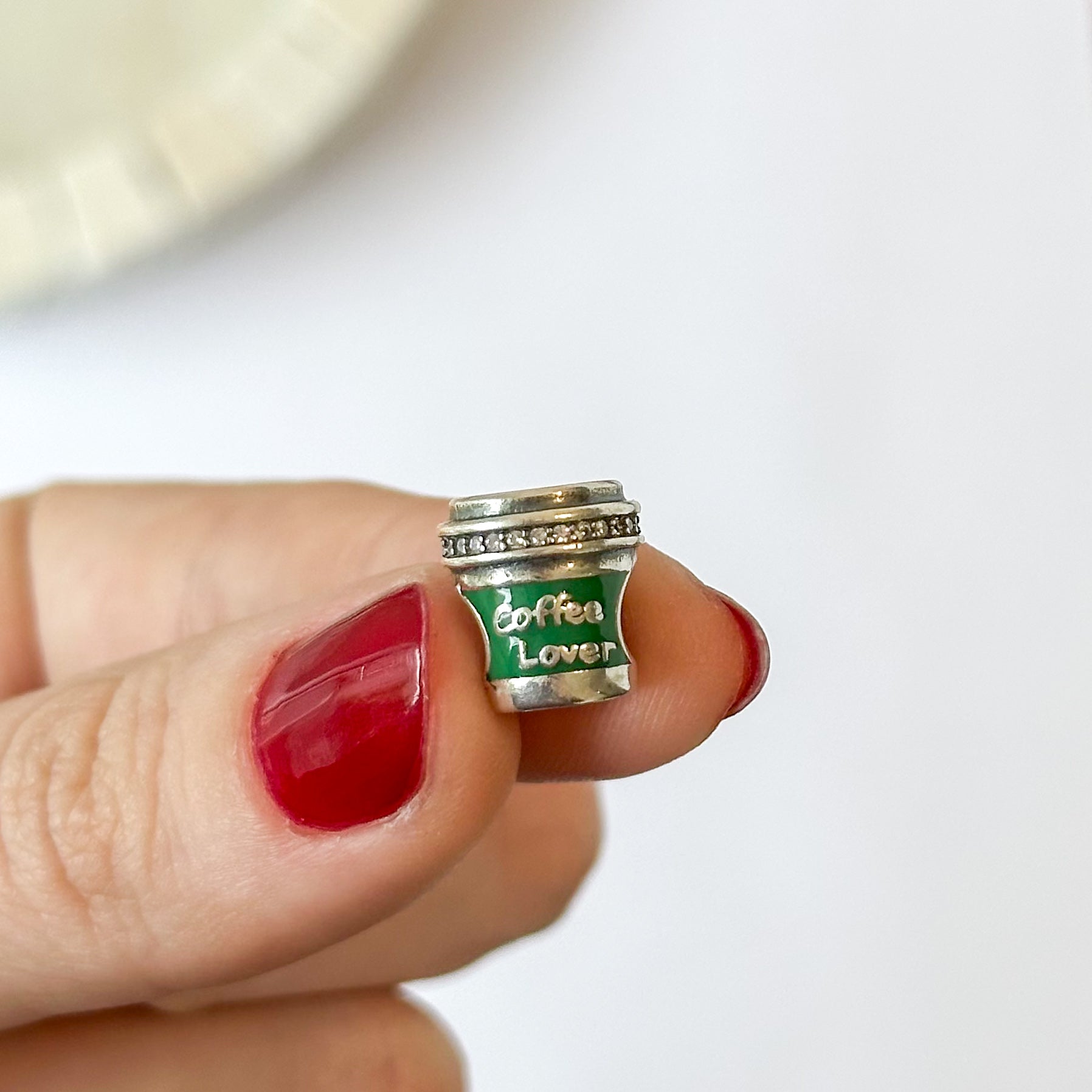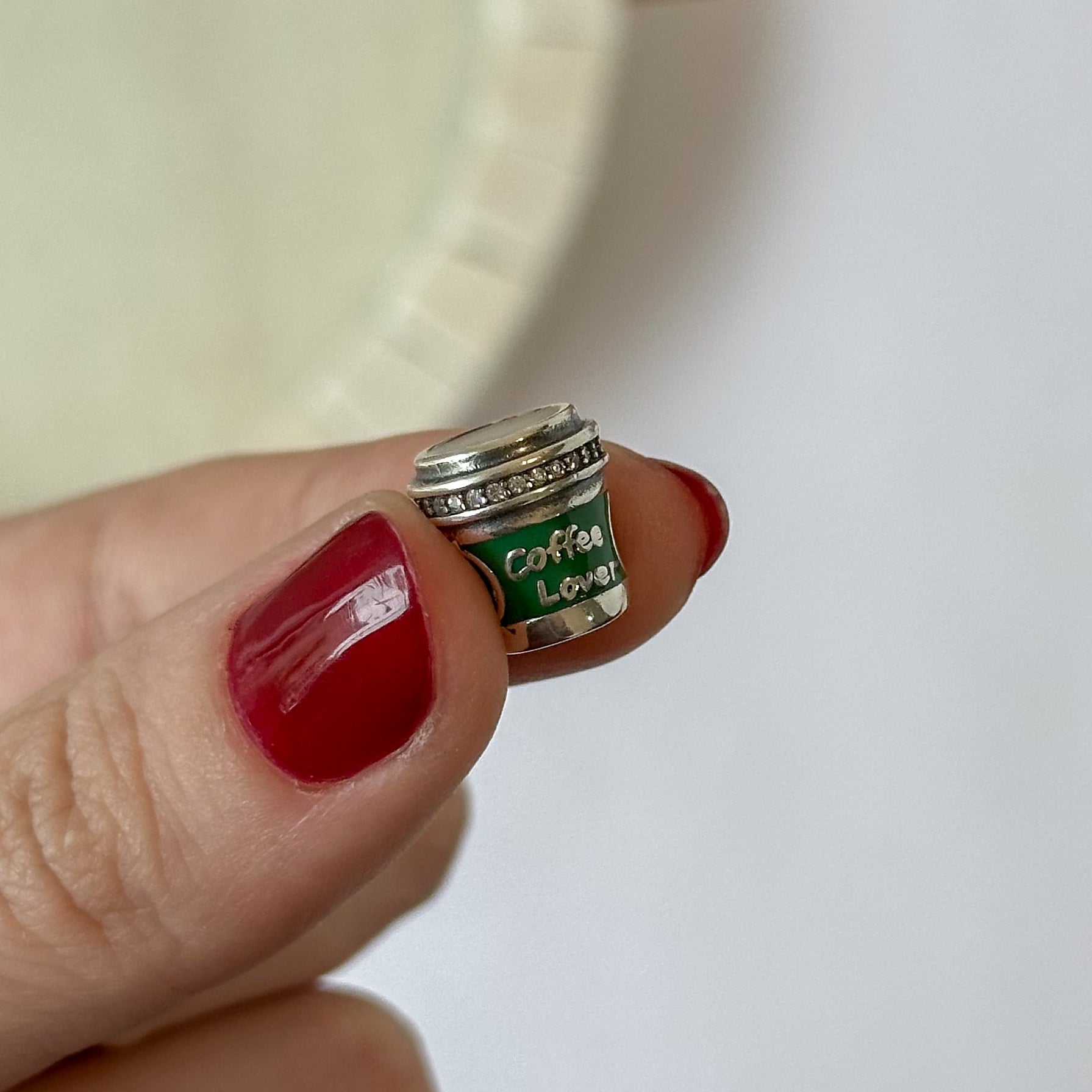 Berloque em Prata 925 esmaltado em verde, no formato de um copo de café, representando aquele momento especial do dia que desperta boas energias.
