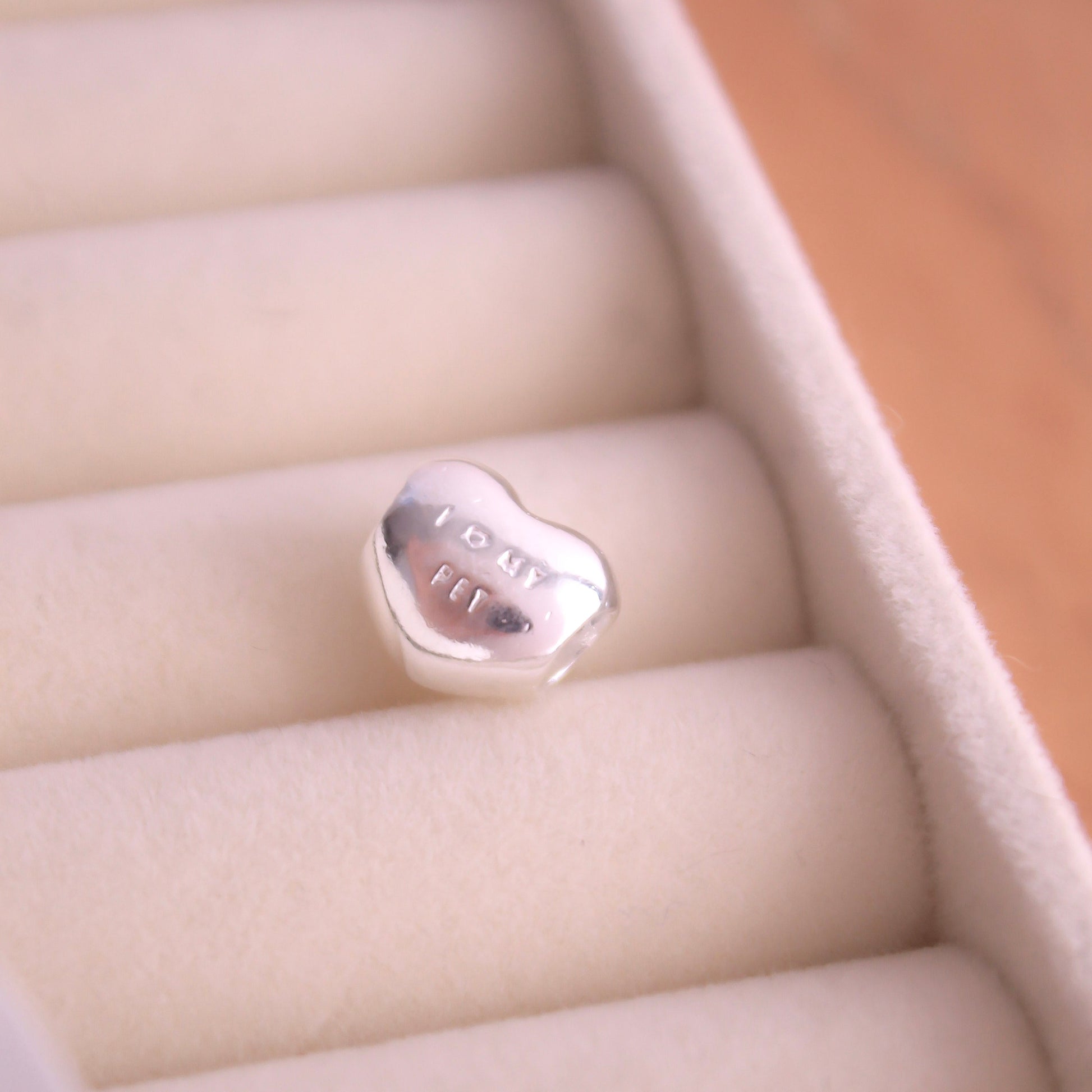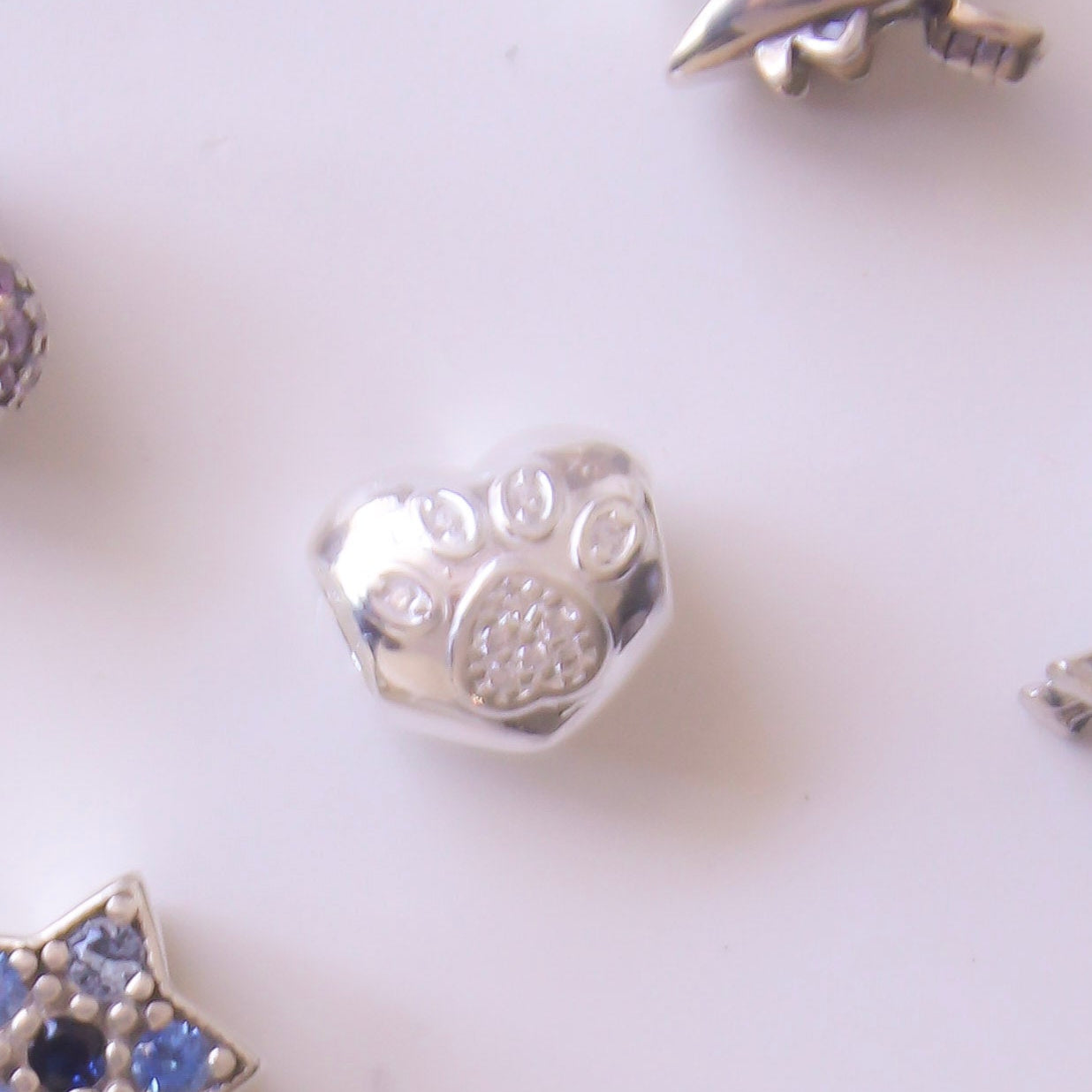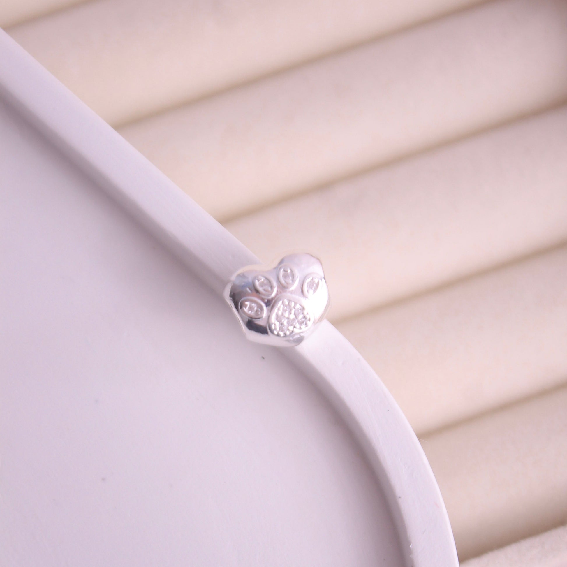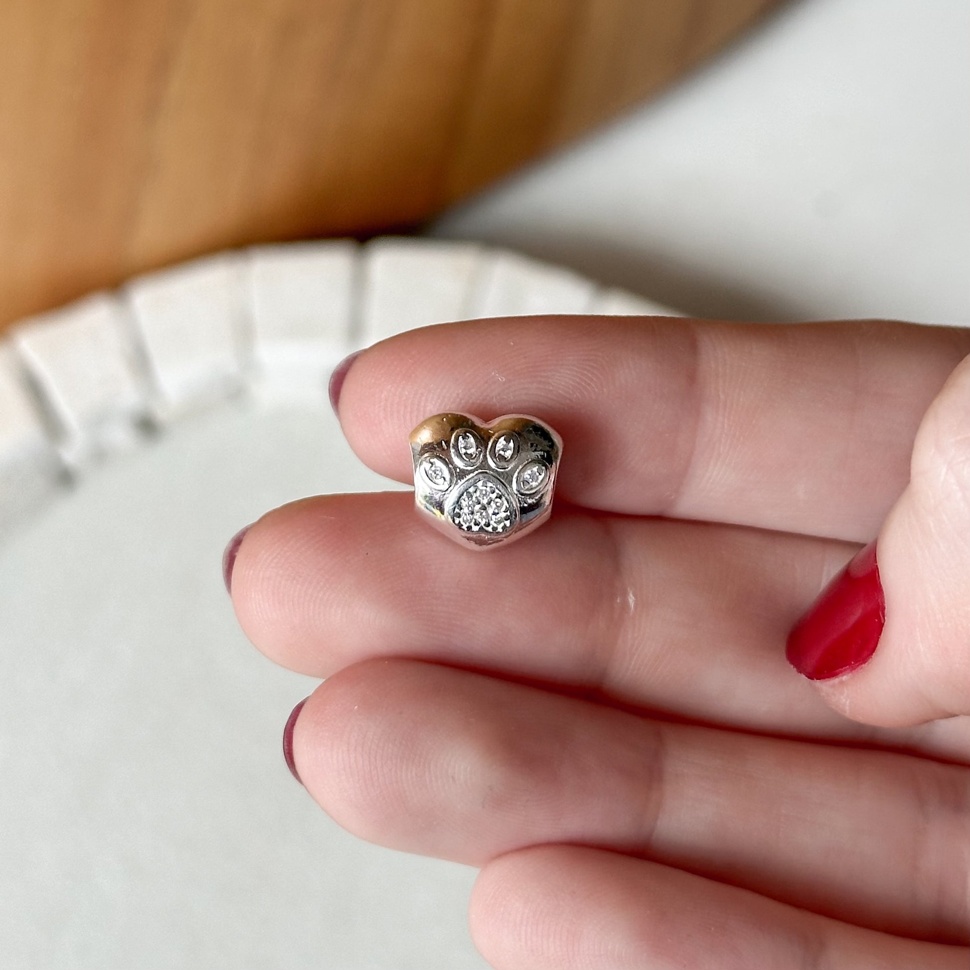 Berloque em Prata 925 no formato de coração com uma patinha cravejada com zircônias, simbolizando amor incondicional e companheirismo.