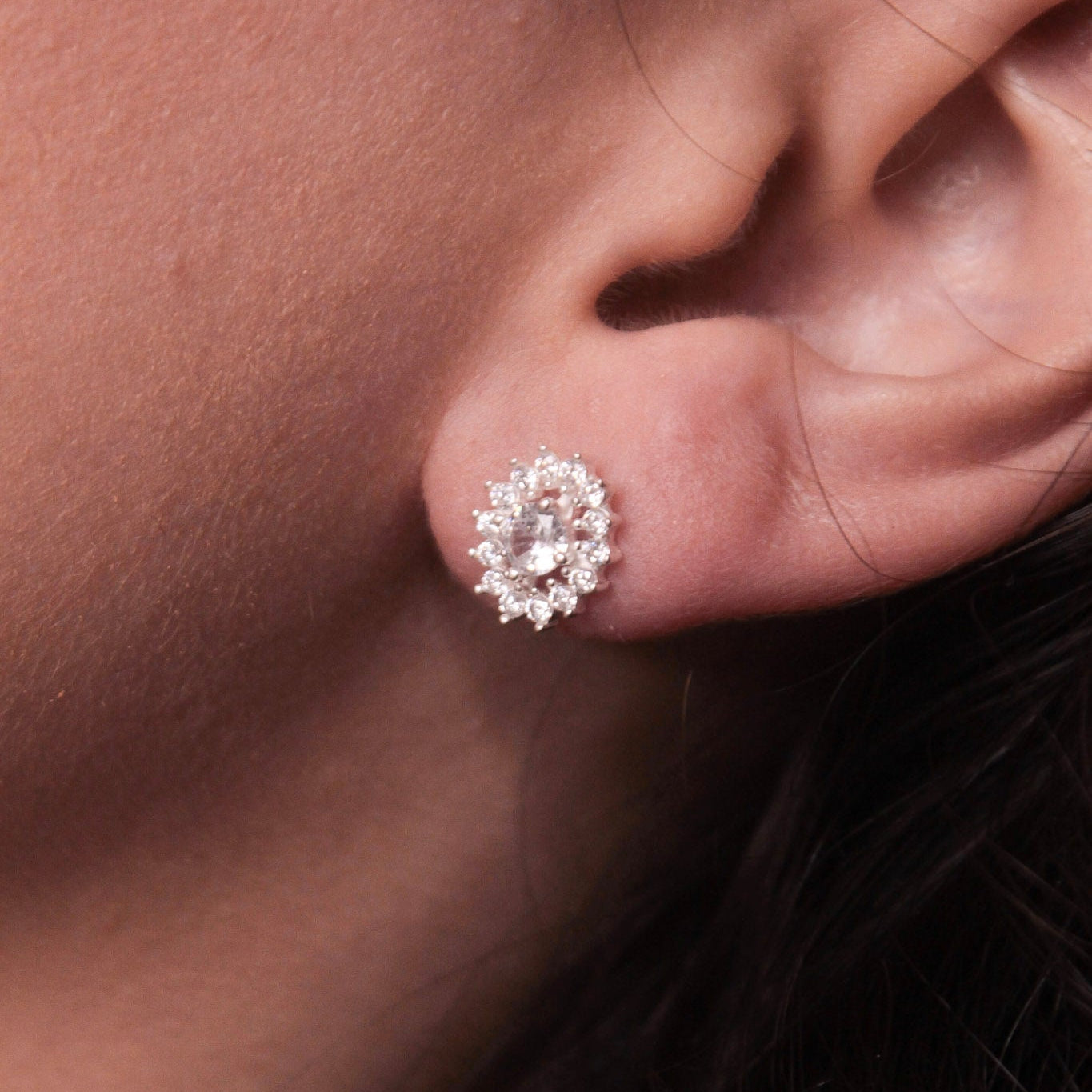 Brinco em formato de flor, delicadamente cravejado com zircônias em Prata 925, destacando uma zircônia central que garante brilho intenso e sofisticado.