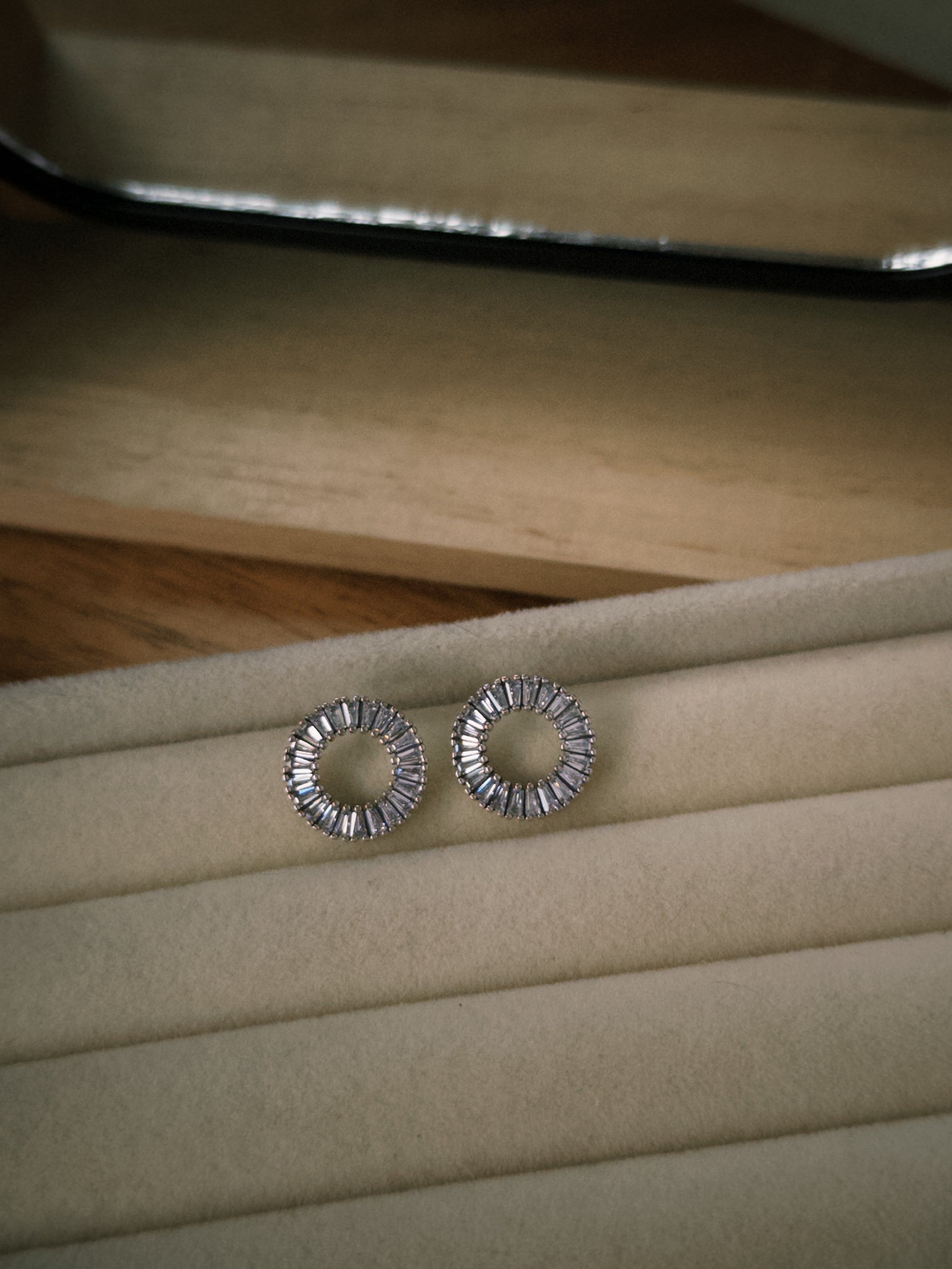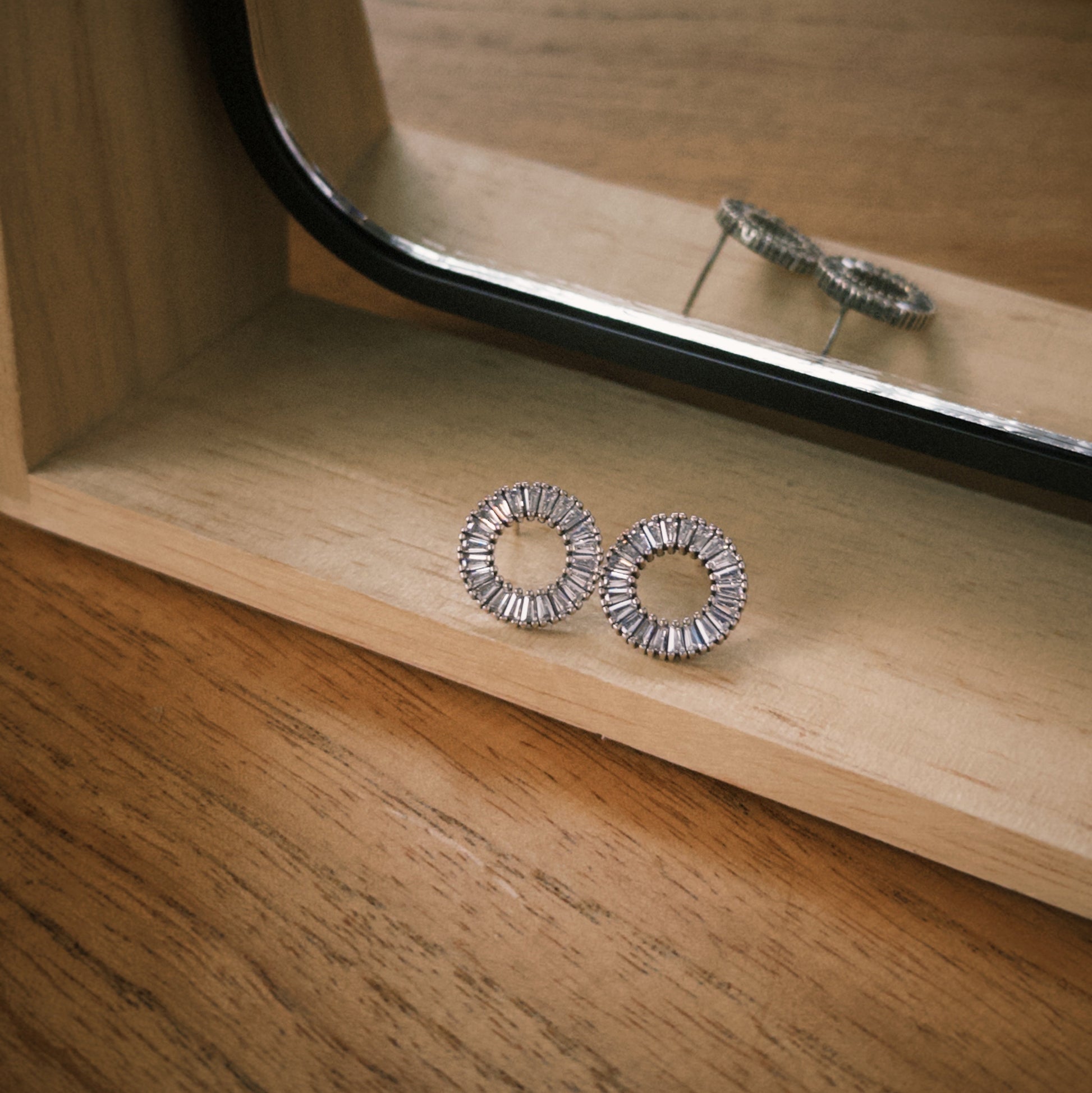 Brinco em formato de círculo vazado em Prata 925, cravejado com zircônias incolores que refletem brilho intenso e sofisticado.