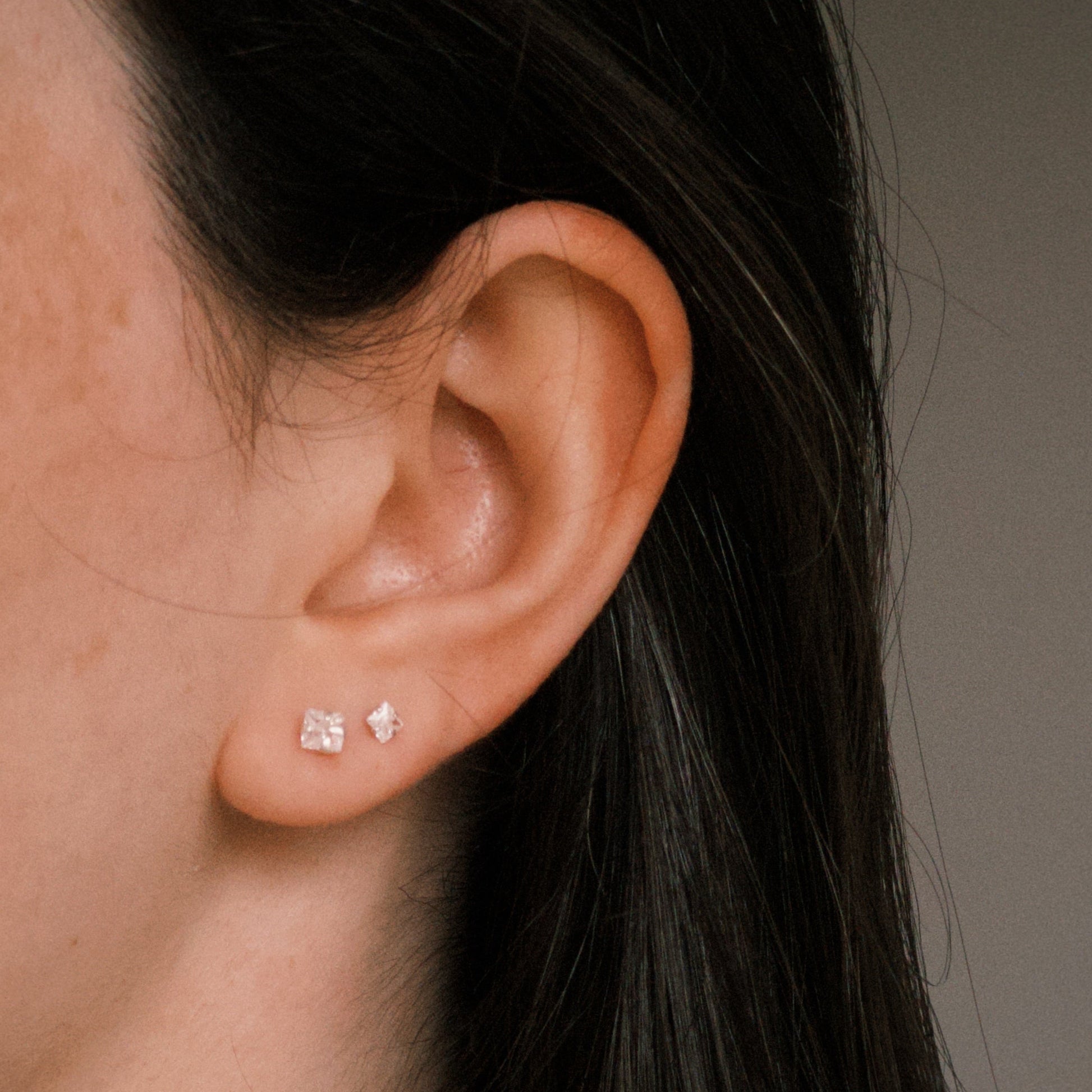 Brinco em Prata 925 com ponto de luz em zircônia quadrada de 4mm em cravação de 4 garras. Perfeito para um toque moderno e delicado.
