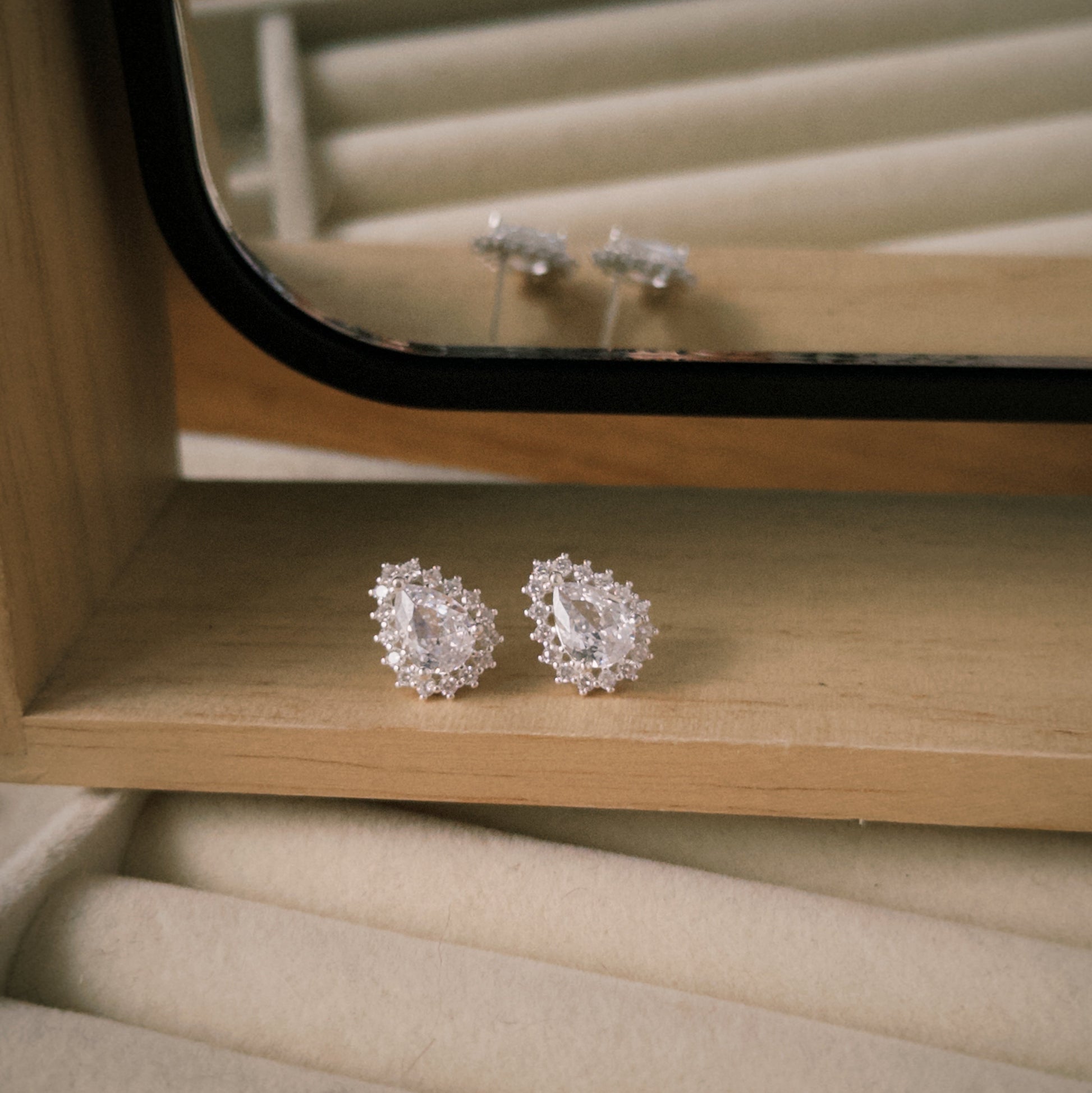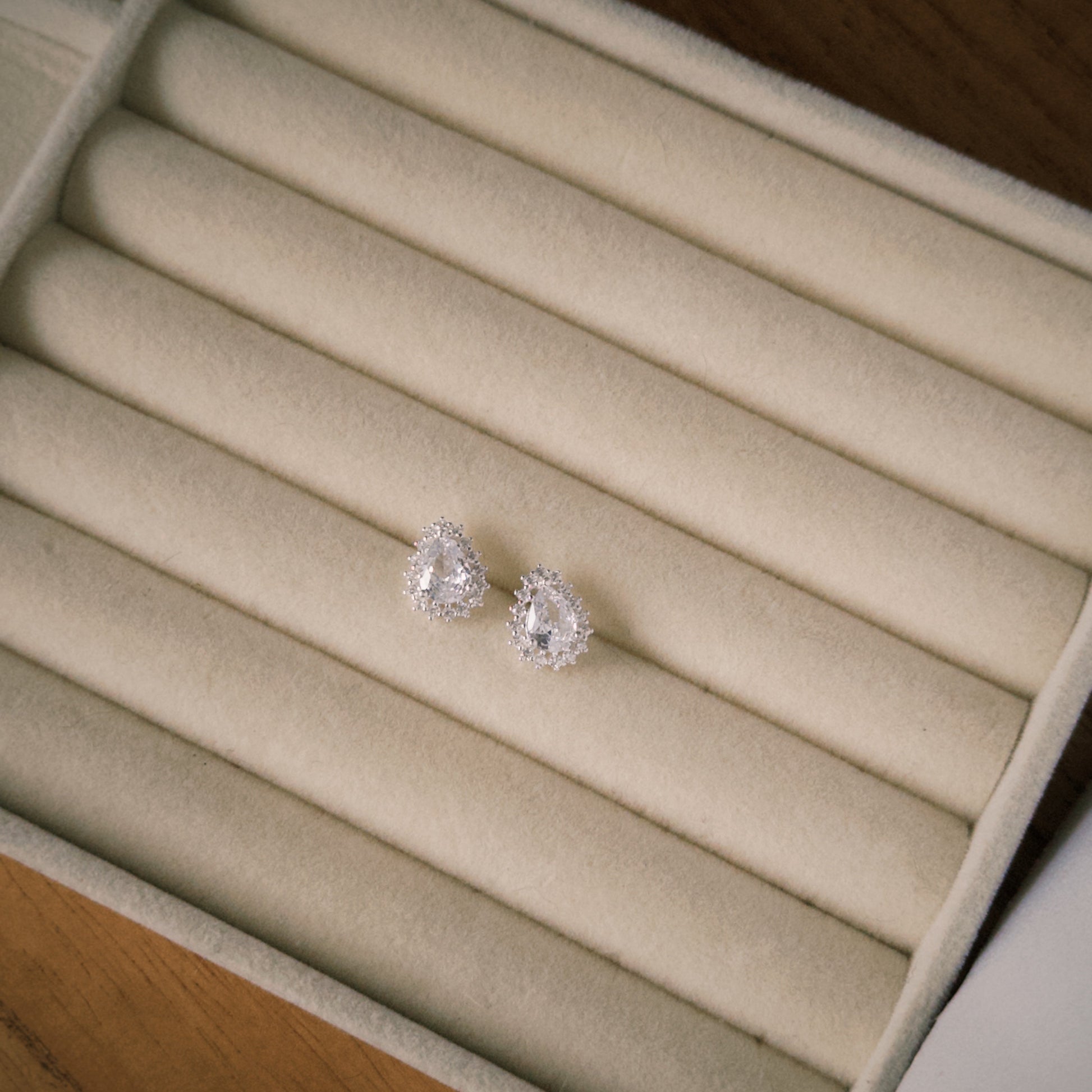 Brinco em formato de gota em Prata 925, com zircônia central em destaque e contorno cravejado de zircônias incolores, trazendo brilho sofisticado e atemporal.