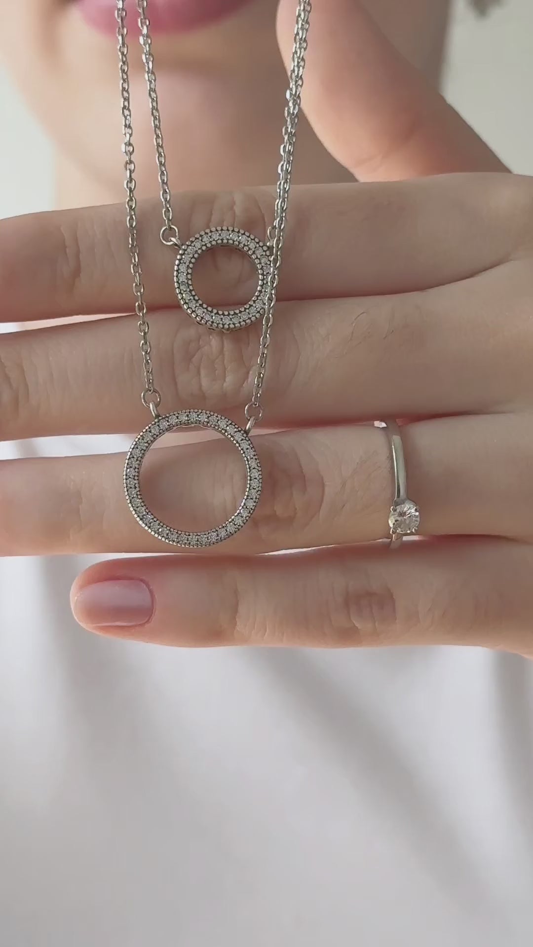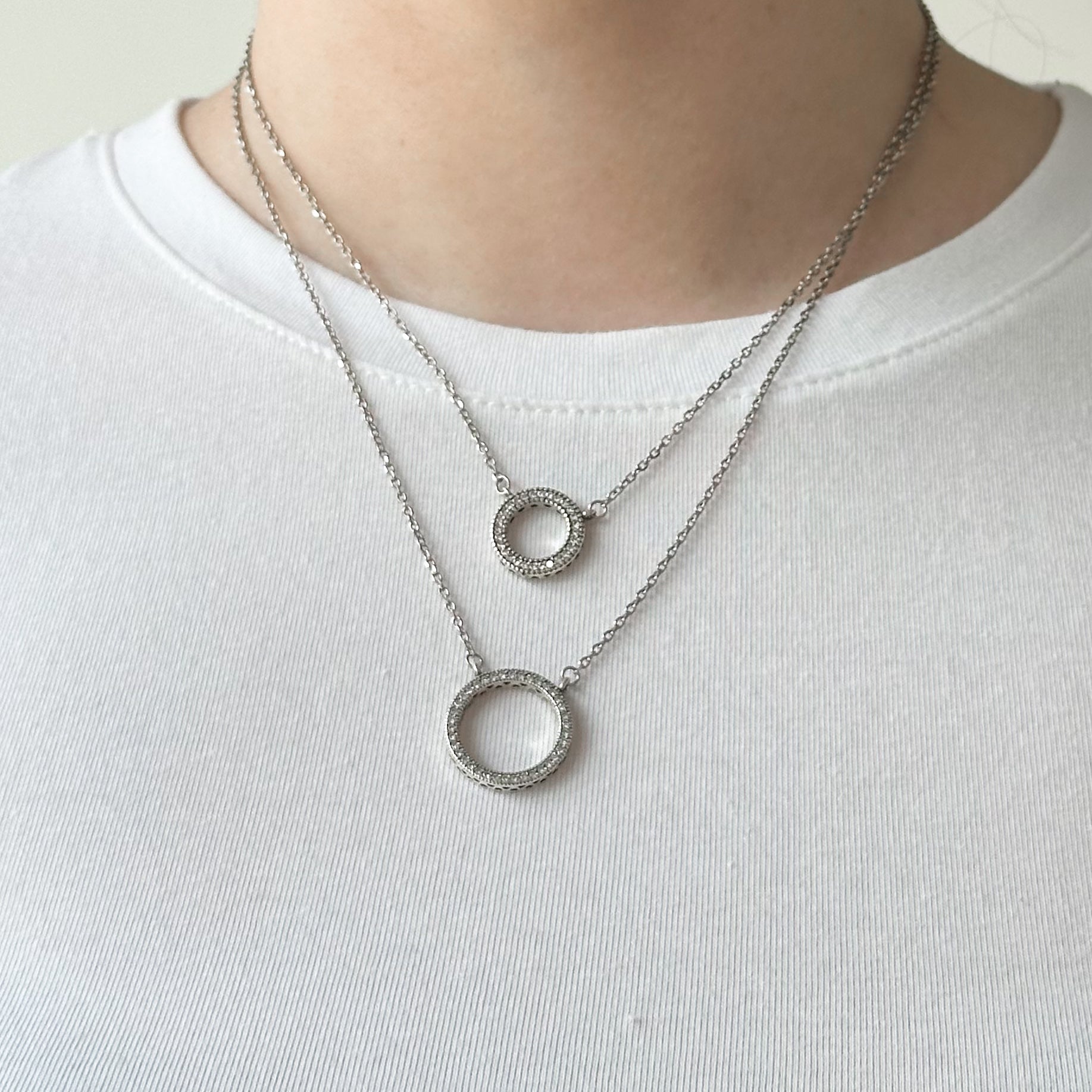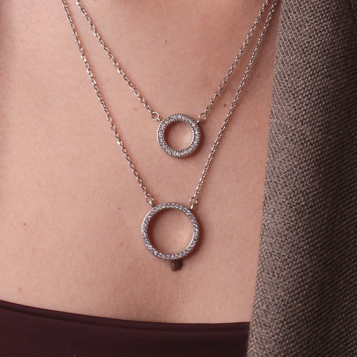Colar duplo em Prata 925 legítima, com duas correntes de alturas diferentes e pingentes circulares de 19 mm e 15 mm, ambos com cravação de zircônias.