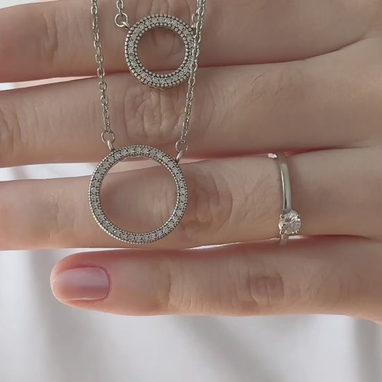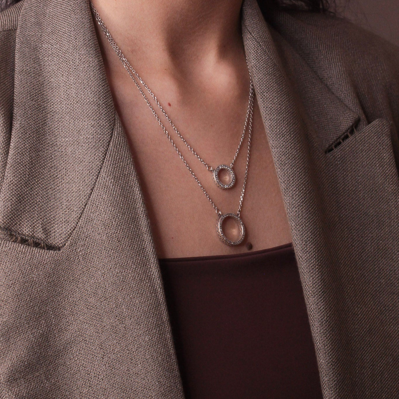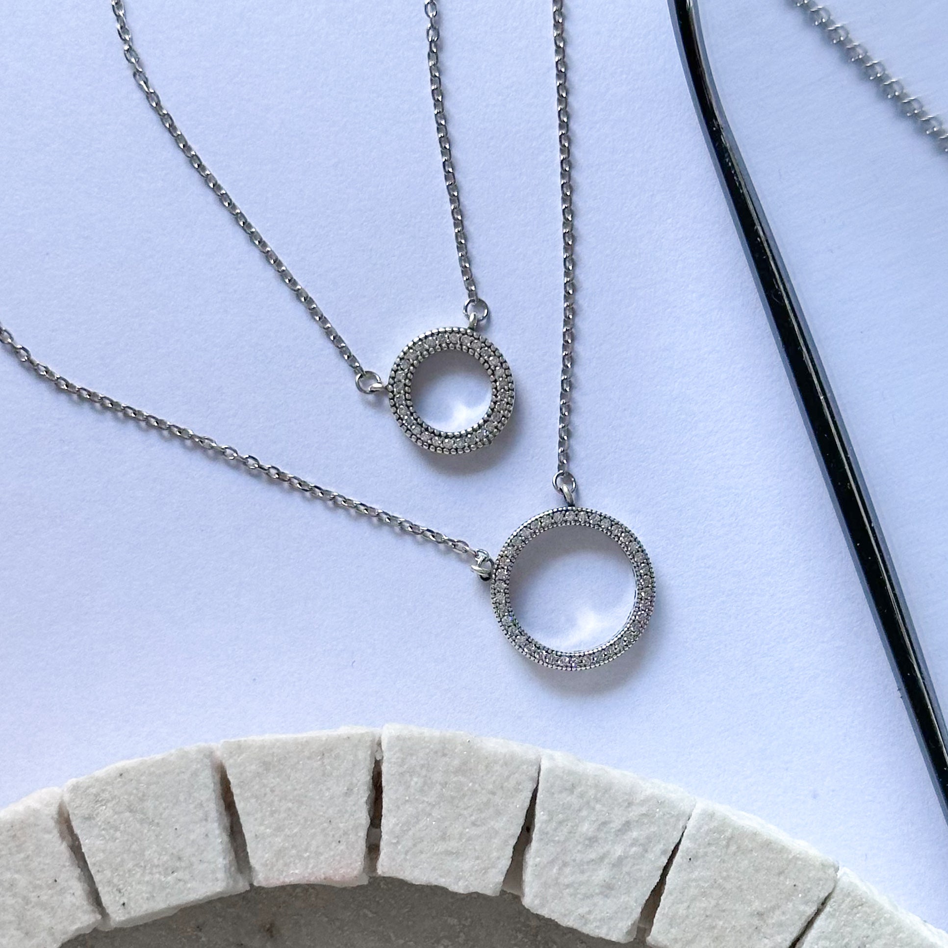 Colar duplo em Prata 925 legítima, com duas correntes de alturas diferentes e pingentes circulares de 19 mm e 15 mm, ambos com cravação de zircônias.