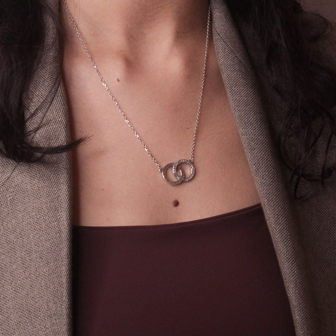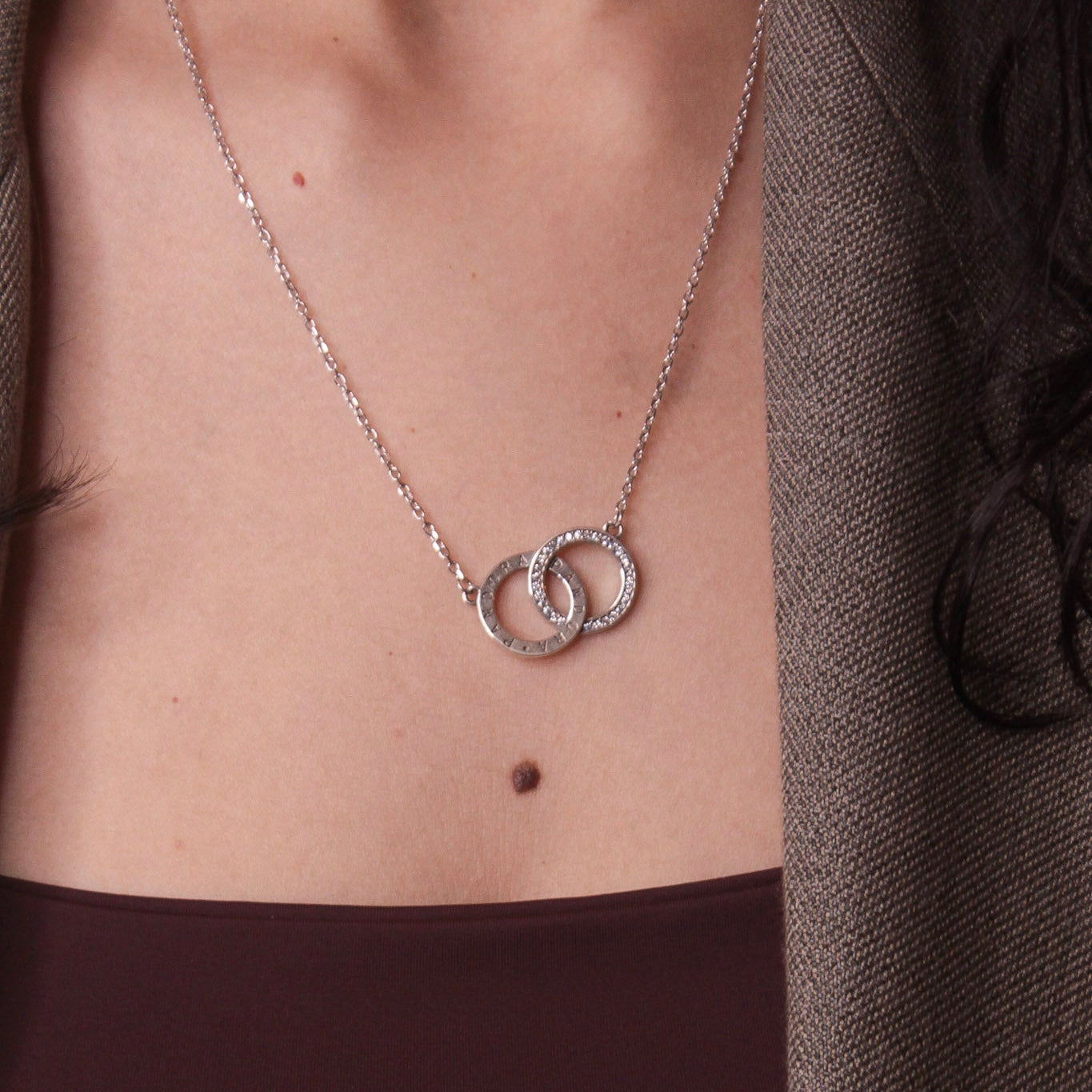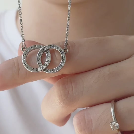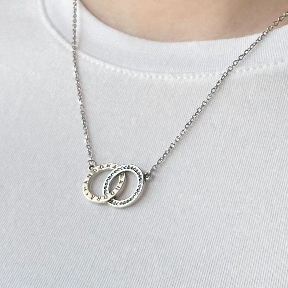 Conjunto em Prata 925 legítima com corrente delicada e pingente formado por dois elos entrelaçados, um com acabamento liso polido e outro cravejado com zircônias.