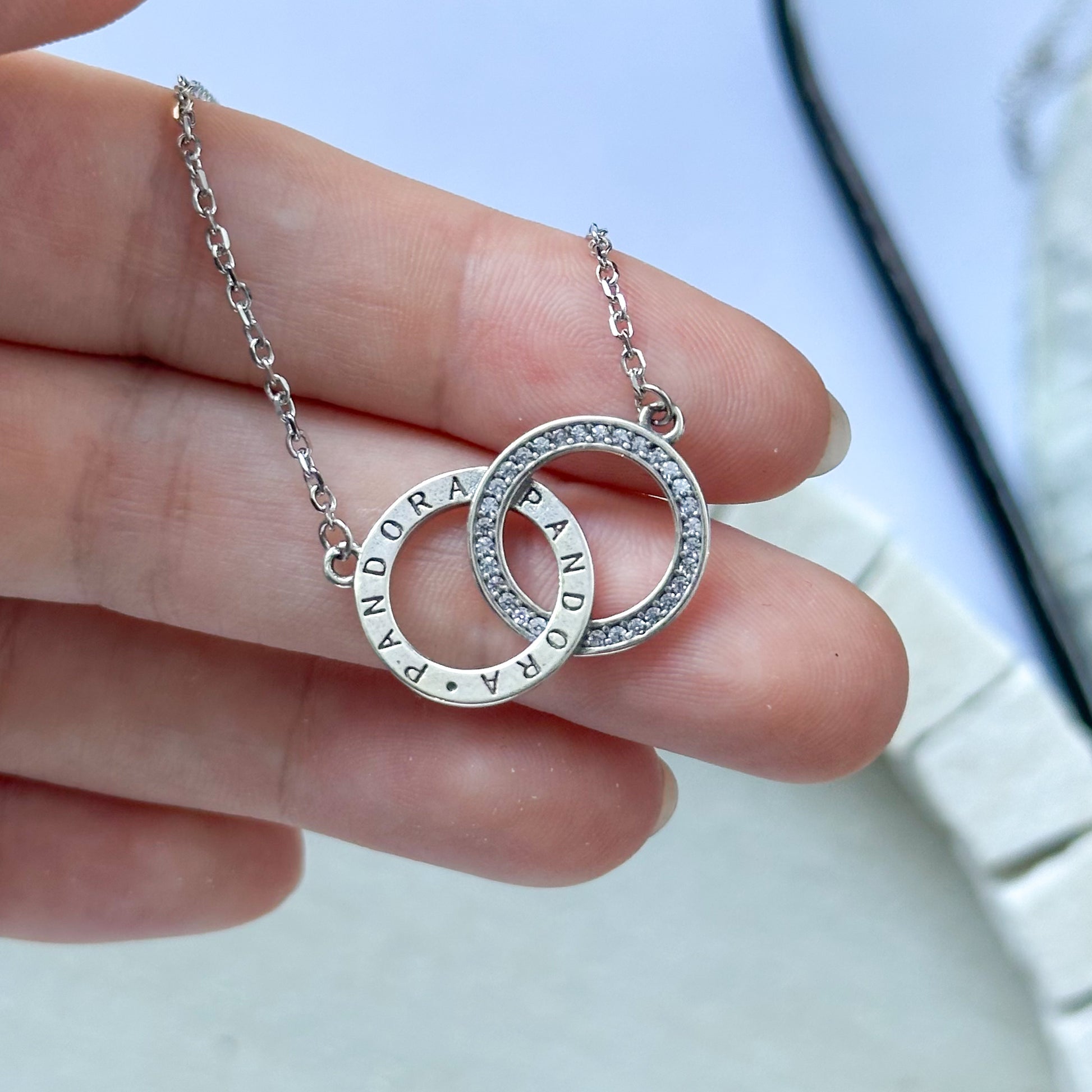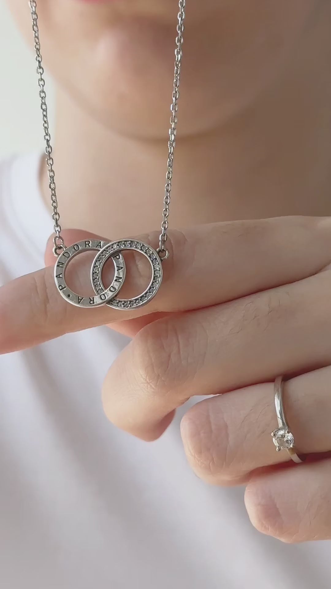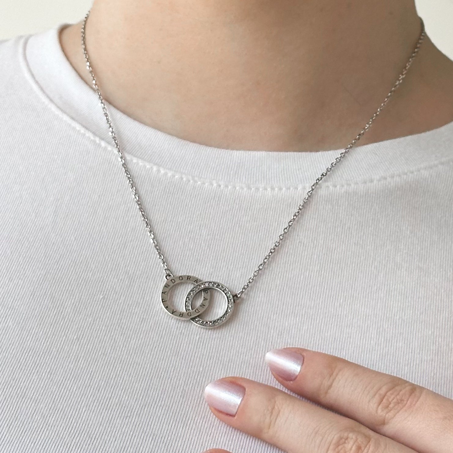 Conjunto em Prata 925 legítima com corrente delicada e pingente formado por dois elos entrelaçados, um com acabamento liso polido e outro cravejado com zircônias.