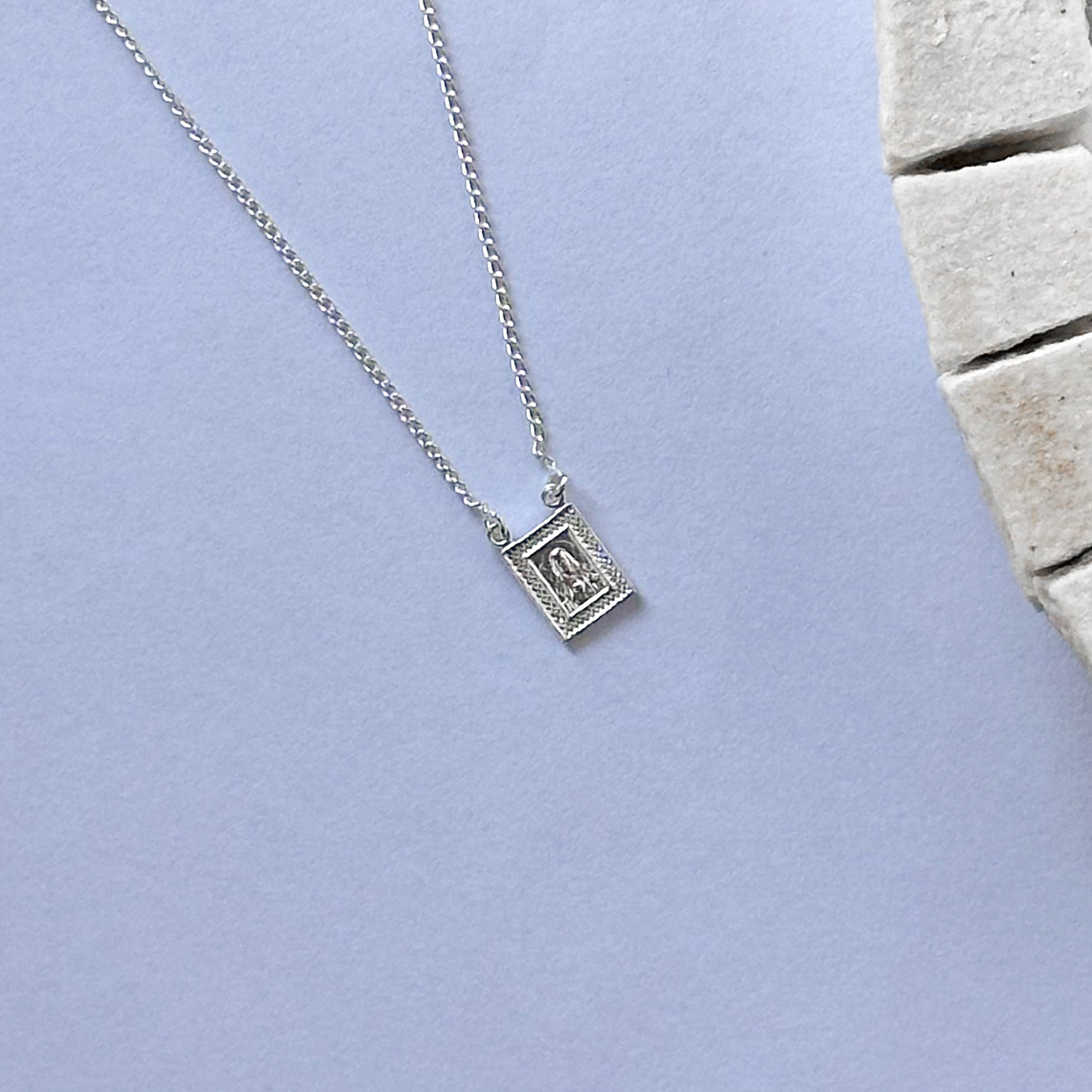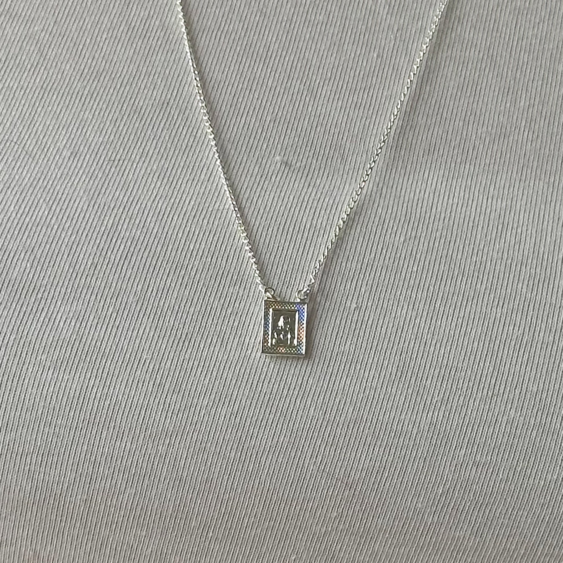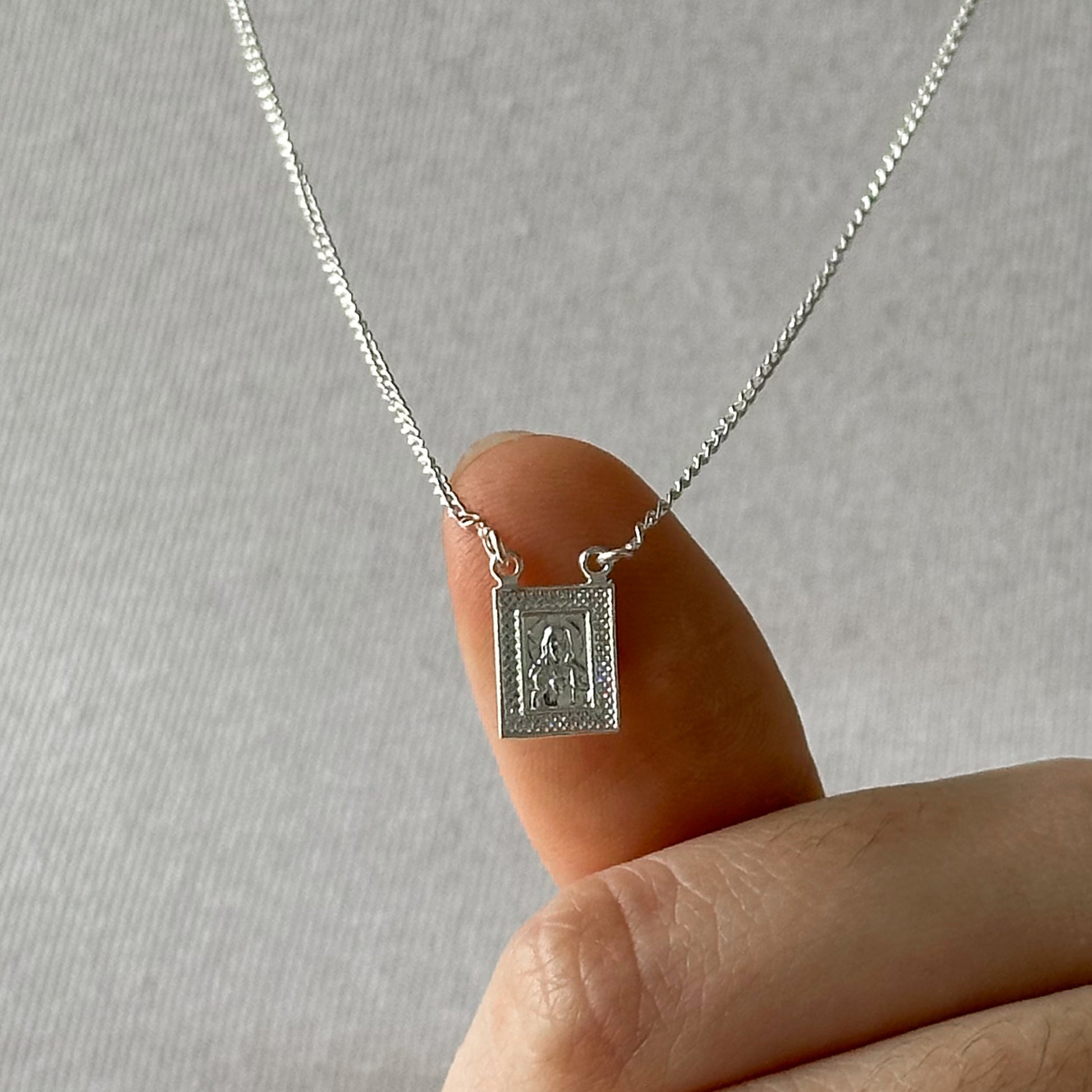 Escapulário em Prata 925 legítima, com corrente elo português, composto por duas placas de 10x8 mm com acabamento polido e alto relevo.