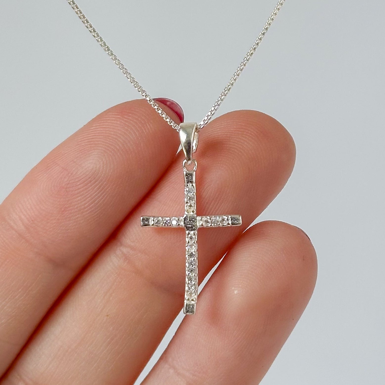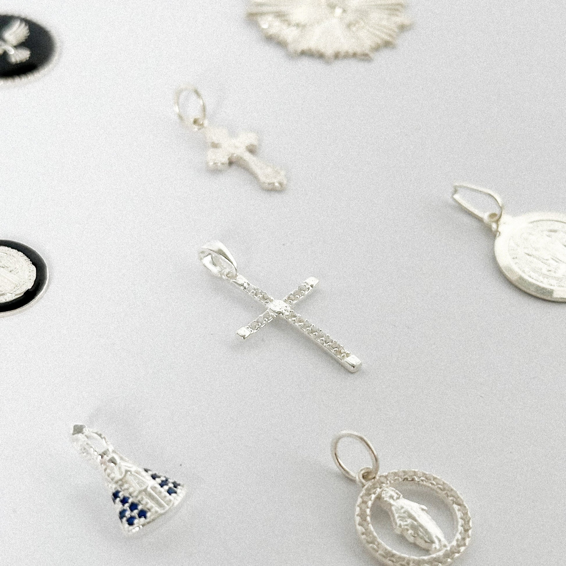 Pingente em formato de cruz clássica, confeccionado em Prata 925 legítima e cravejado com zircônias incolores que refletem um brilho intenso e sofisticado.