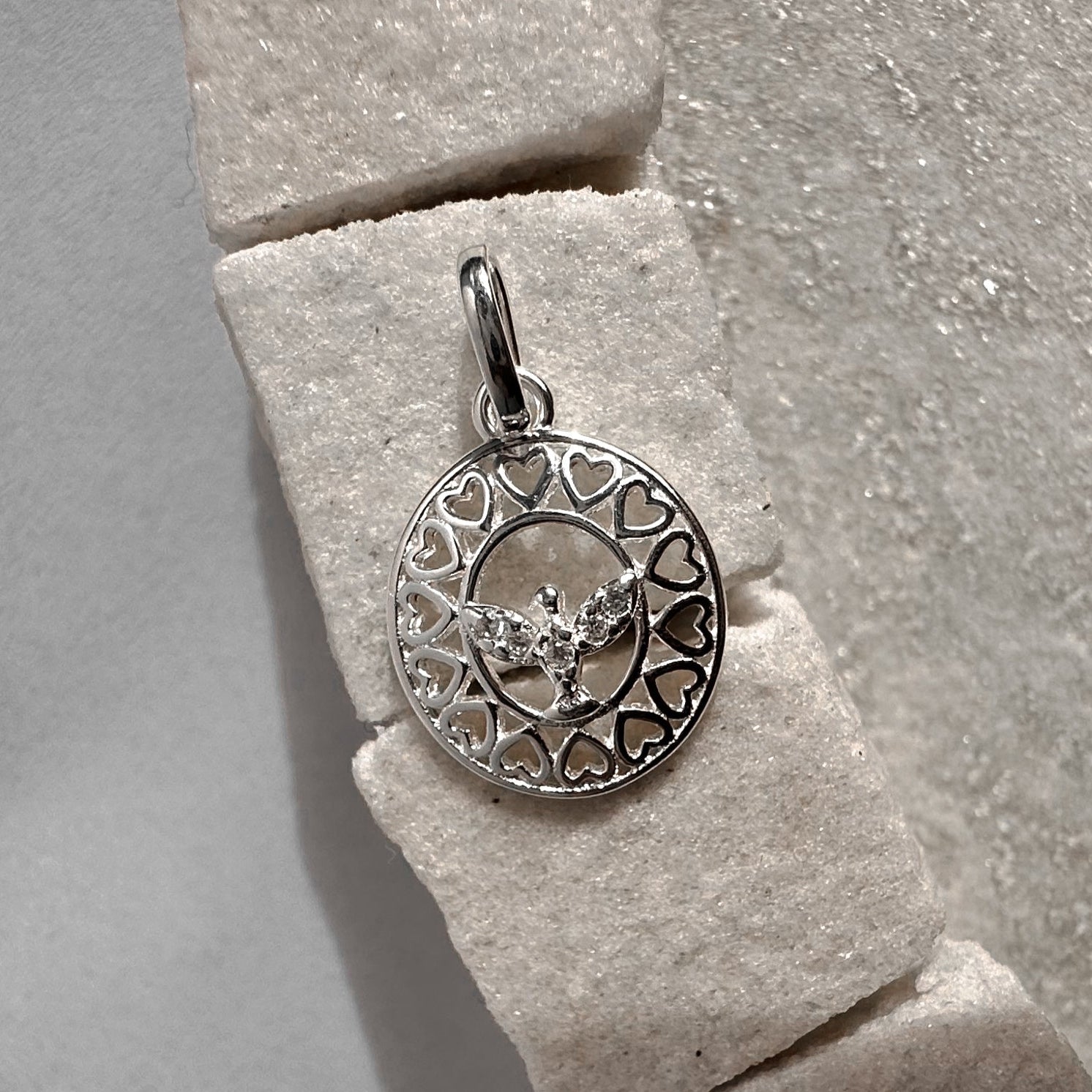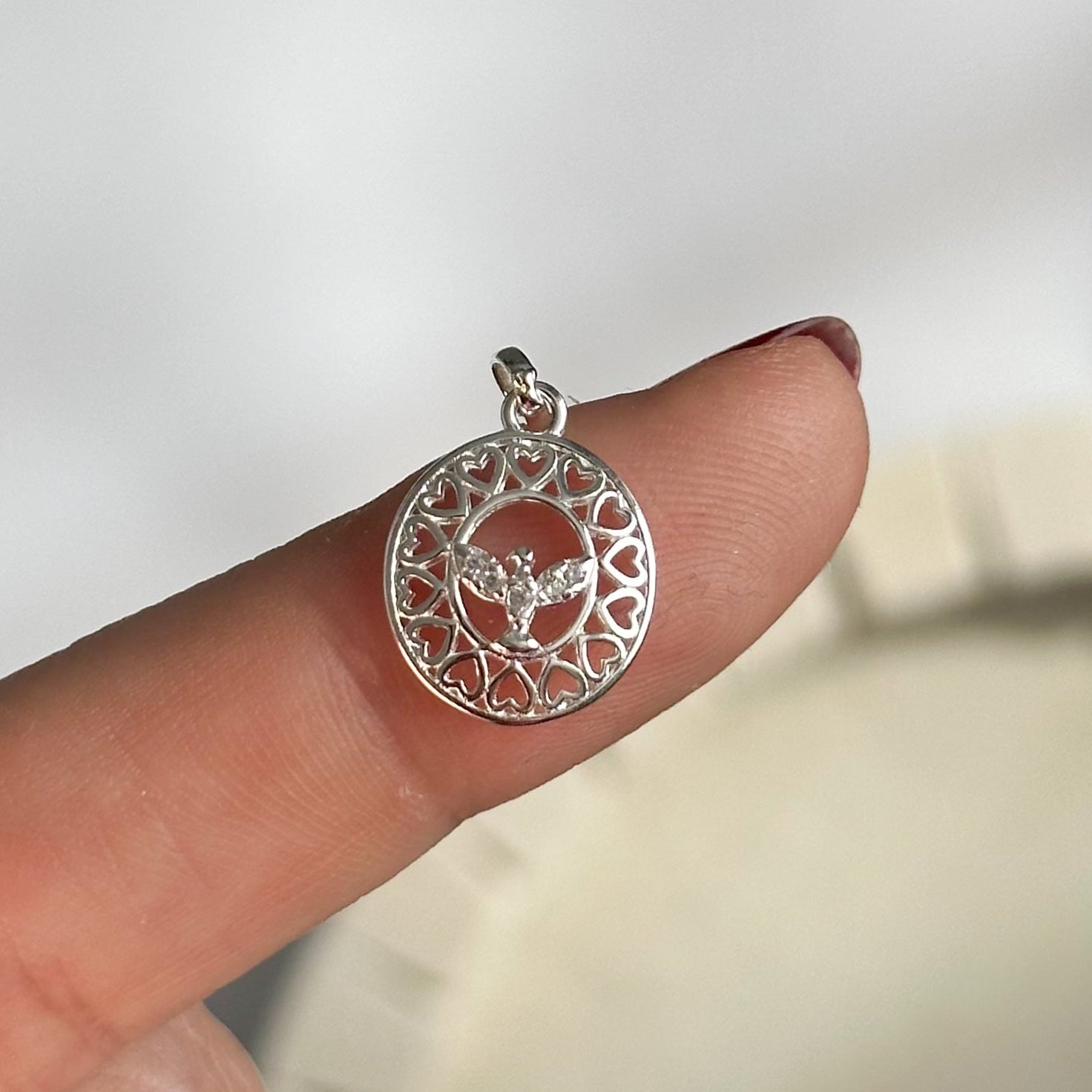 Pingente em Prata 925 legítima, com medalha vazada e delicados detalhes em formato de coração ao redor. No centro, o Espírito Santo em destaque é cravejado com zircônia.