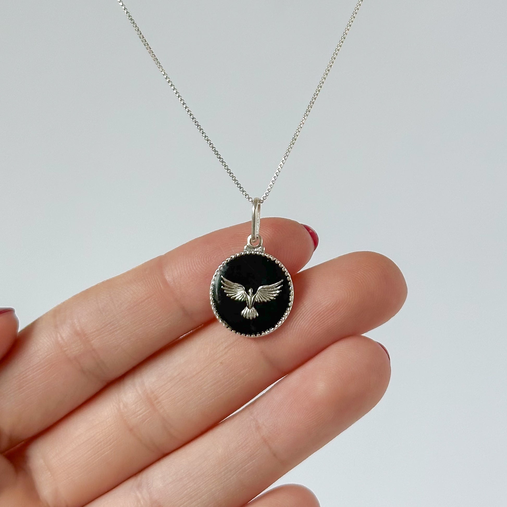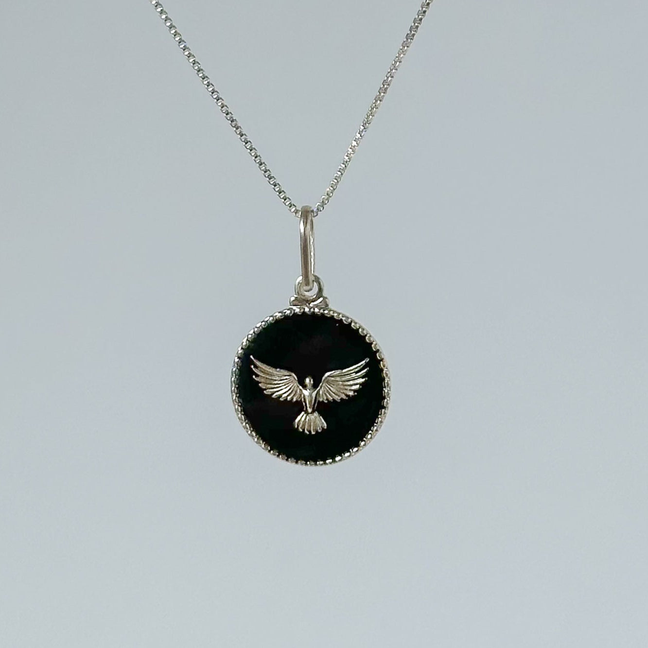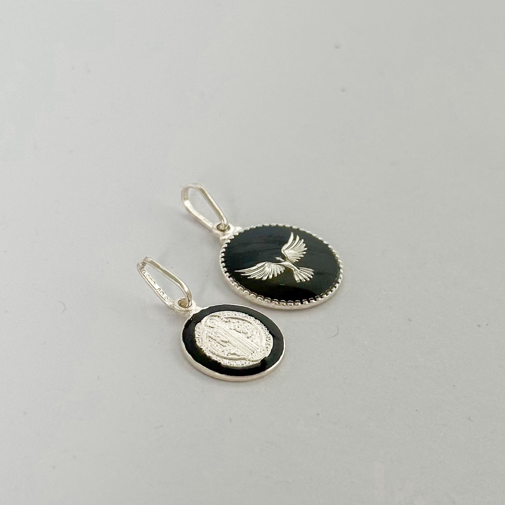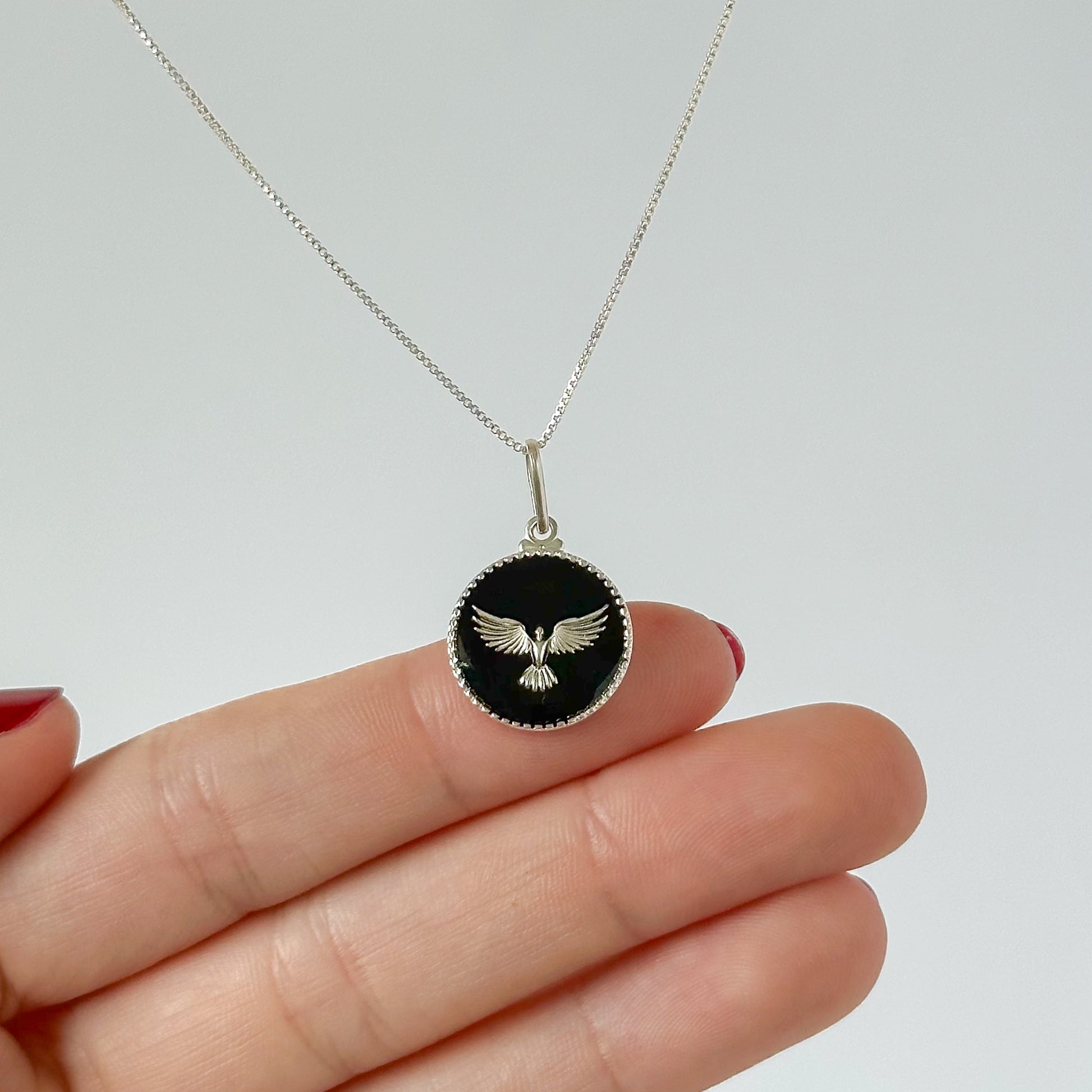 Pingente confeccionado em Prata 925 legítima, com placa esmaltada em preto e o Divino Espírito Santo em relevo no centro.