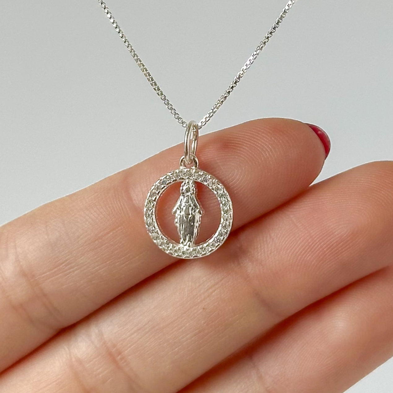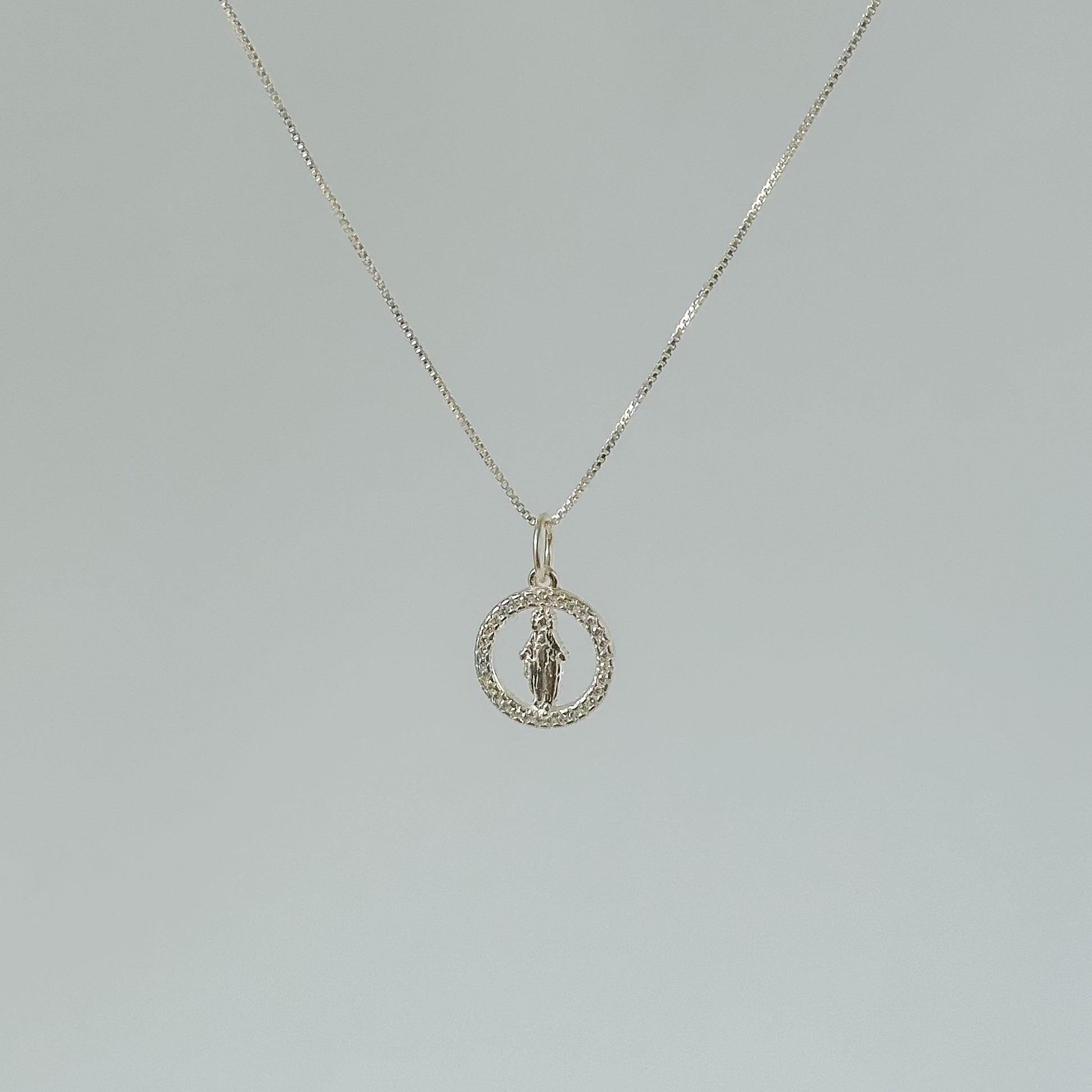 Pingente confeccionado em Prata 925 legítima, com aro circular delicadamente cravejado com zircônias, trazendo ao centro a imagem da Nossa Senhora Aparecida em relevo.