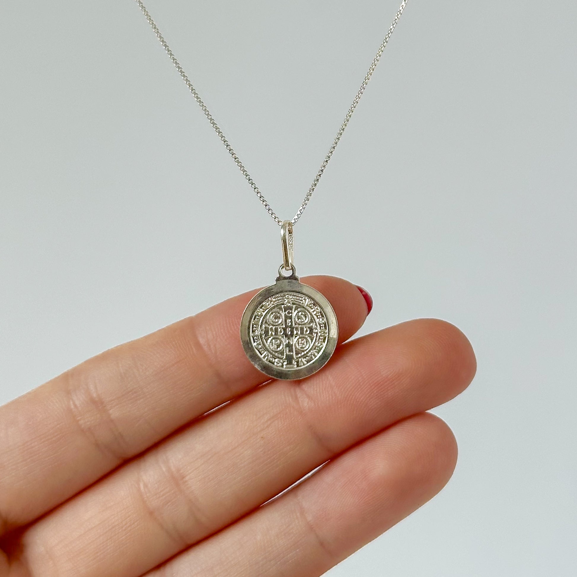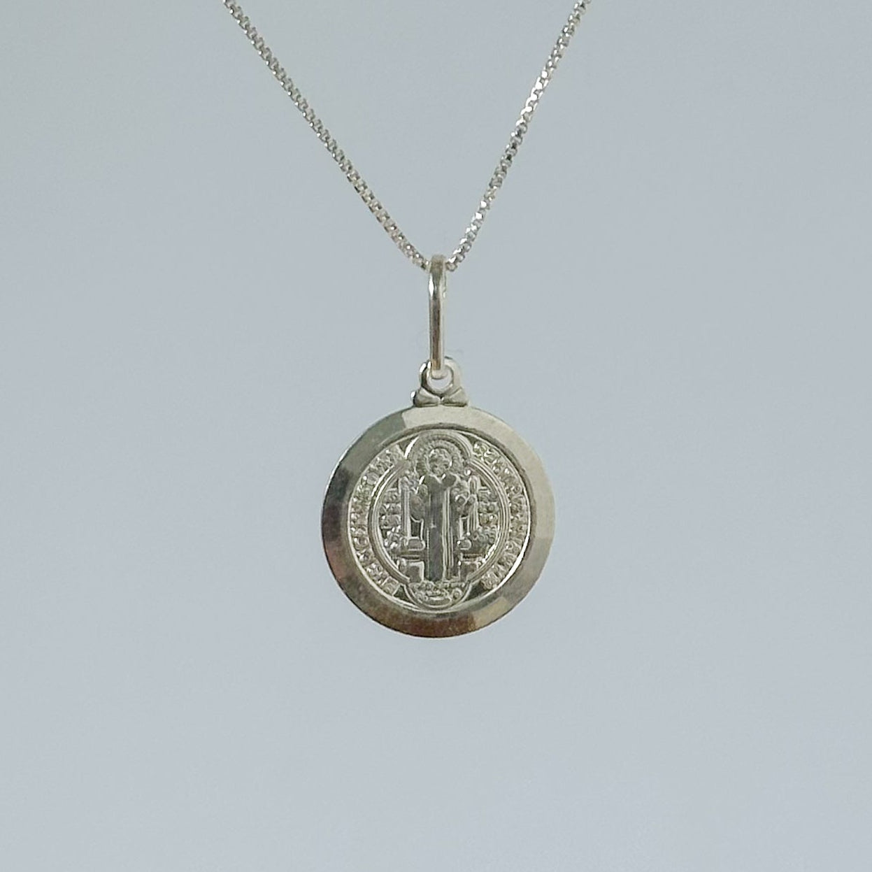 Pingente confeccionado em Prata 925 legítima, com medalha de São Bento em alto relevo e acabamento polido.