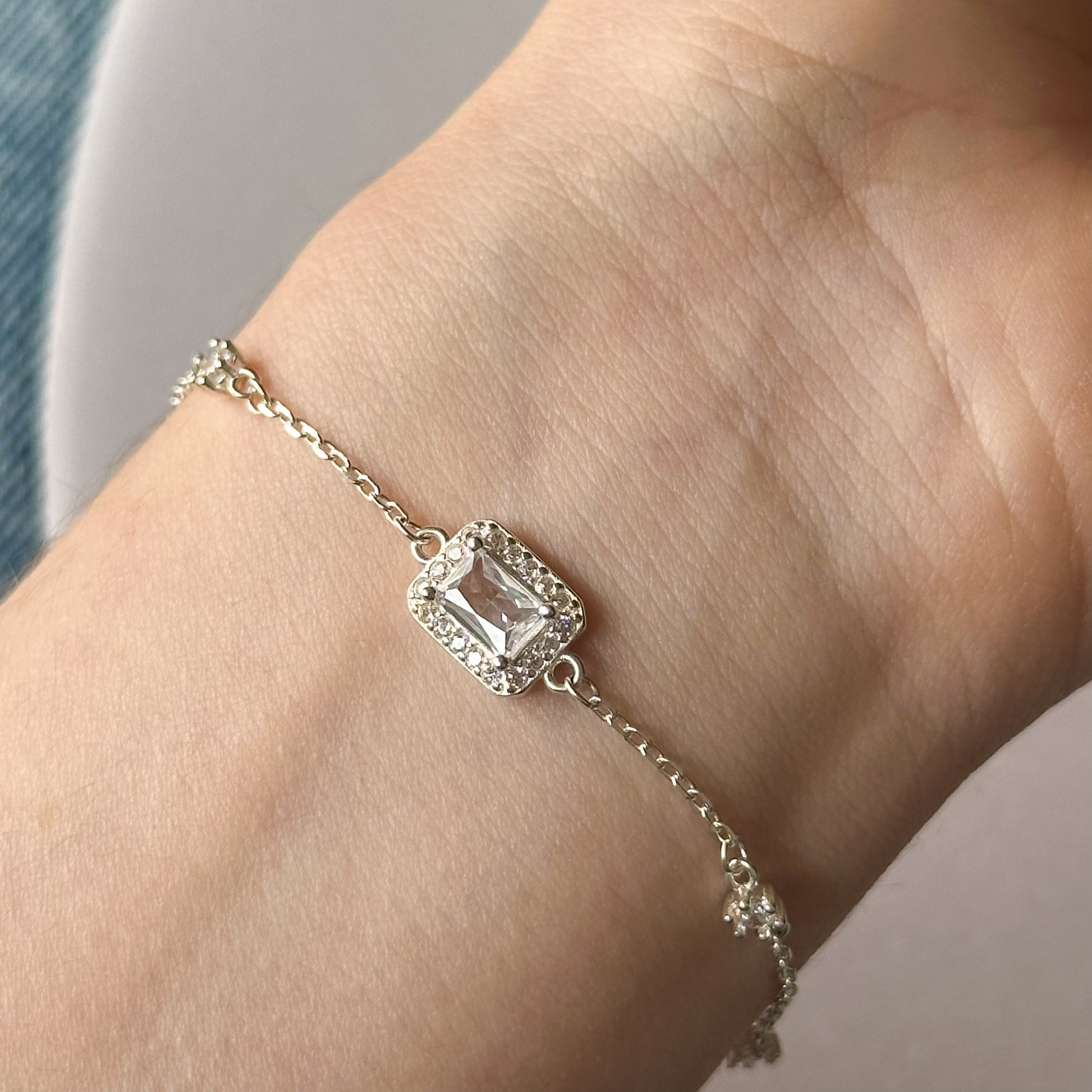 Pulseira em Prata 925 com elo cadeado, quatro zircônias e destaque central retangular cravejado com pontos de luz ao redor.