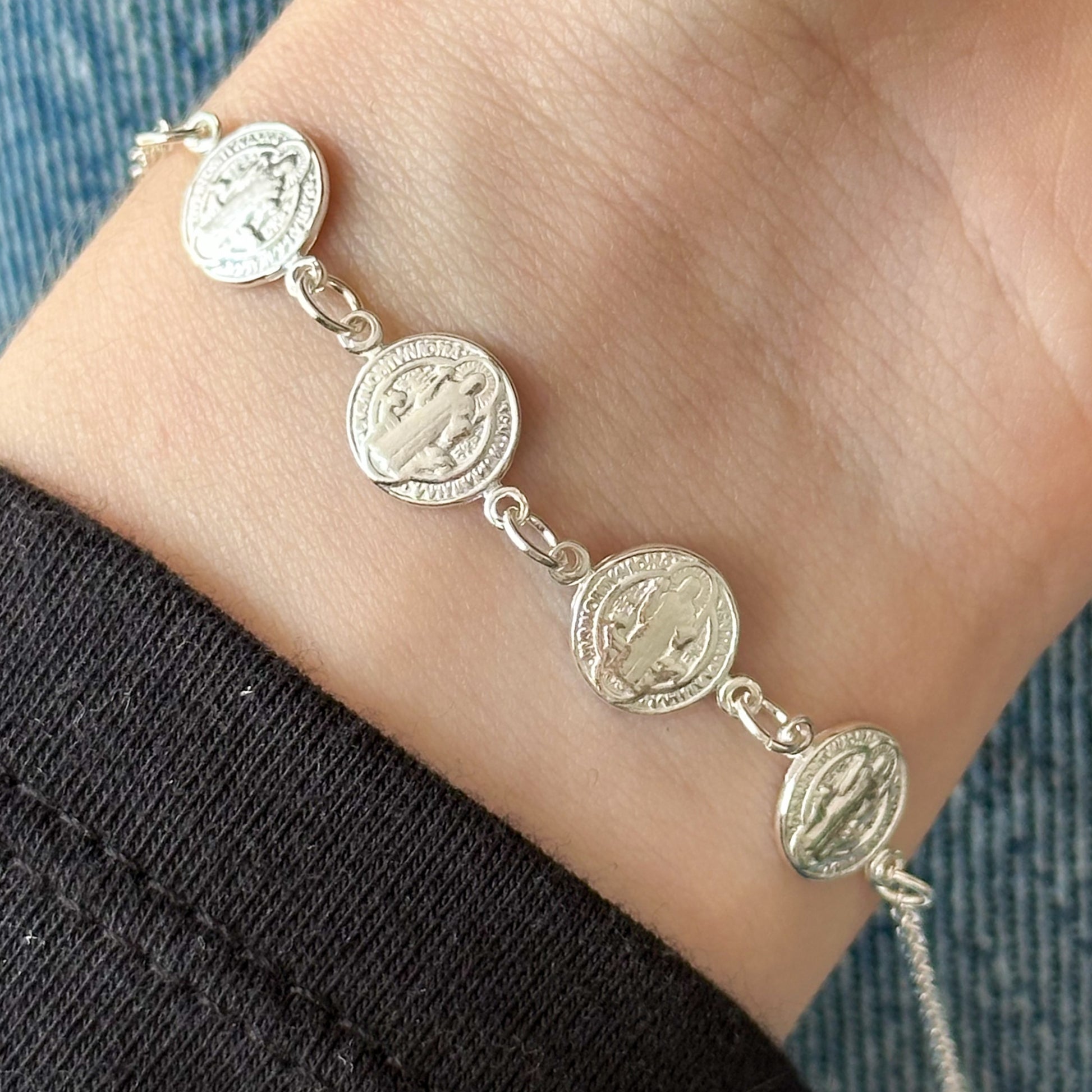 Pulseira confeccionada em Prata 925 legítima, com elo cadeado e com medalhas de São Bento delicadamente conectadas.